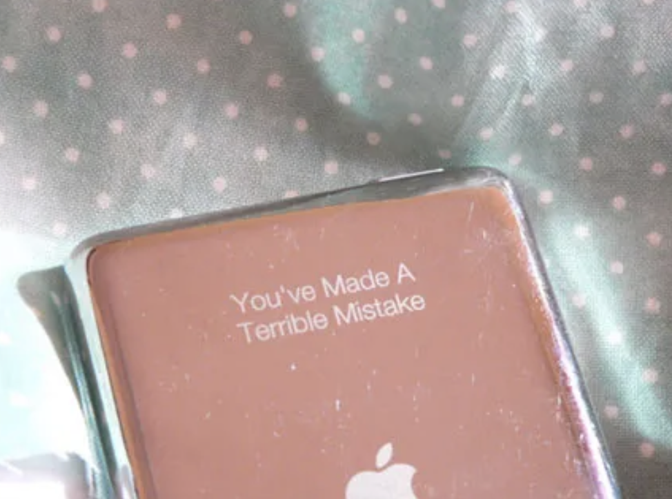 November 25, 2006 — After three years, my boyfriend and I break up. He’s funny and smart, but I just don’t see it lasting. We meet at a restaurant to say a final goodbye, and he tells me he has a ‘parting gift.’ It’s an iPod, and when I flip it over, the engraving says, “You’ve made a terrible mistake.”
