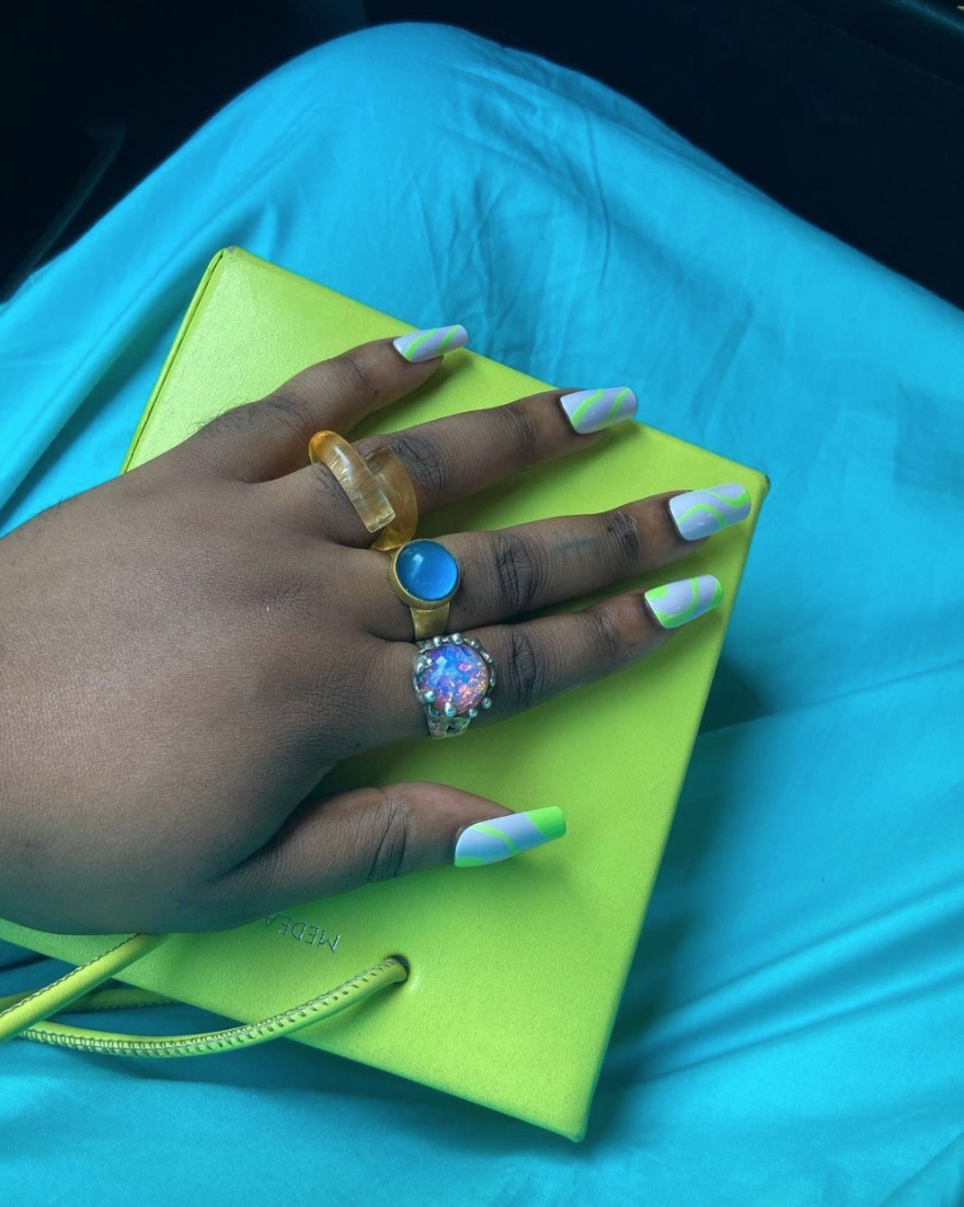 Yes, they’re all press-ons from beauty supply stores or Nail Candy. I started using them when COVID hit. Doing them myself is way cheaper, and nail salons have been very fraught for me. Like I said, I sometimes have a hard time being out, and any environment like that — hair salons, nail salons — puts me on edge. But I still want to look cute!
