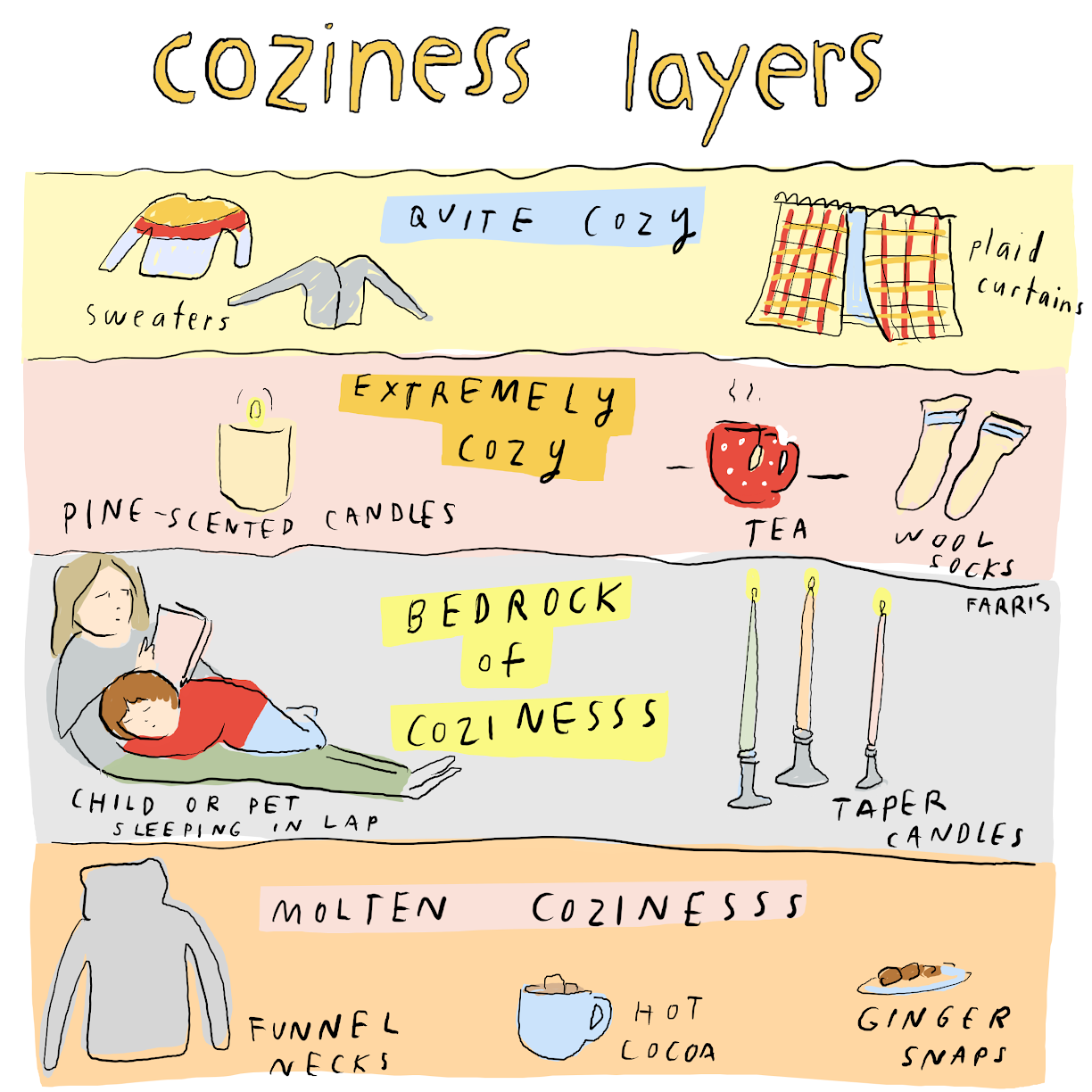 Sensory Cozy: lavender baby powder, hot with a splash of bourbon, and a big fluffy towel straight out of the dryer after a salt bath.
