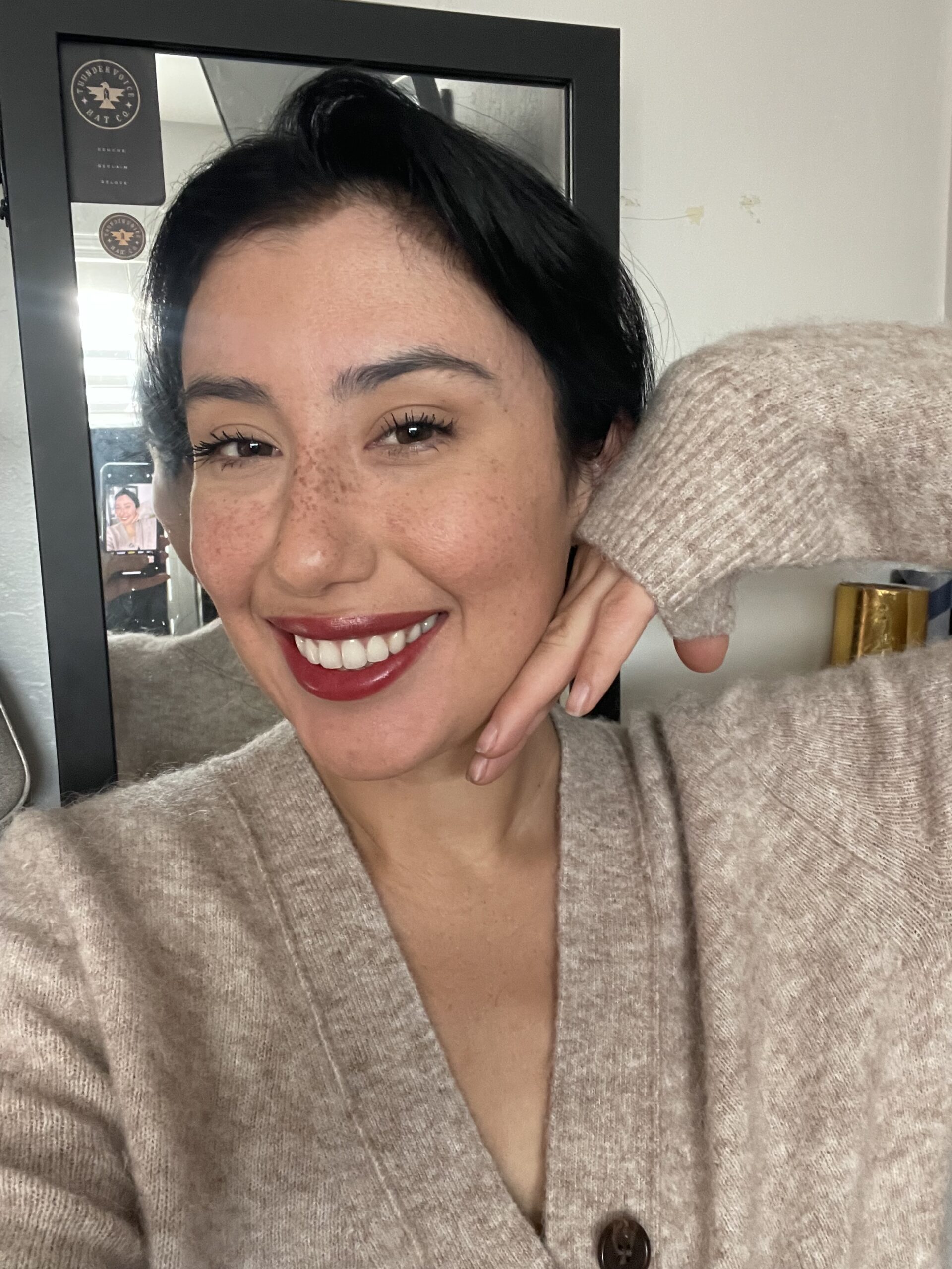 Jannelle Sanchez, our beloved editorial/marketing assistant, regularly rocks a red lip or glowy cheek on our Zoom calls. When we asked her how she does it, she joked that she has a “low-key high-maintenance approach.” Here, Jannelle reveals her favorite $6 lipstick, a one-minute hair trick, and the age her mom *finally* let her wear makeup…