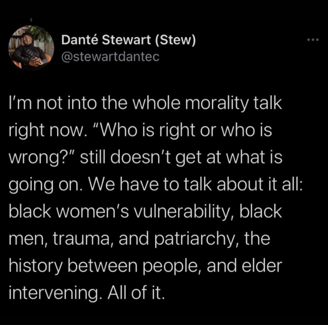 “Violence is never ‘proof of love.’ that’s a deadly idea that has fueled and excused domestic (and all) violence for far too long. think hard about that take, please.” These are the words of Glennon Doyle, an acclaimed white author. While I agree with her sentiment, reading it still made me pause. Because how can she so confidently and immediately share her thoughts on social media, when she has never experienced the combination of factors at play? In this case, there are complicated issues to consider: racism, public mockery, shame, class, trauma, and so much more. Is now the best time for her to contribute to this particular online conversation?