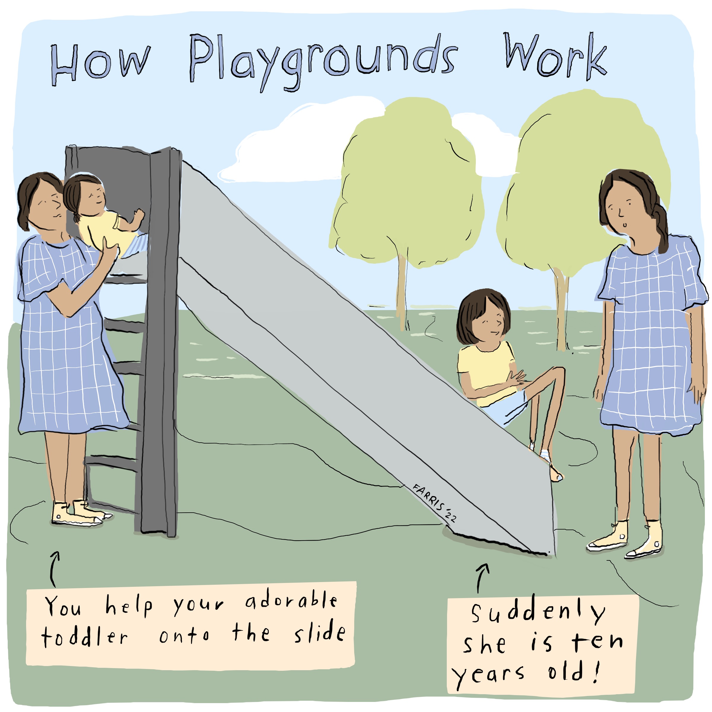 What about how the size of the playground seems to literally change over time. It looks so big and scary when you have a little barely walking toddler and in a blink of an eye, it shrinks in front of you as they grow. Or so it just me?!