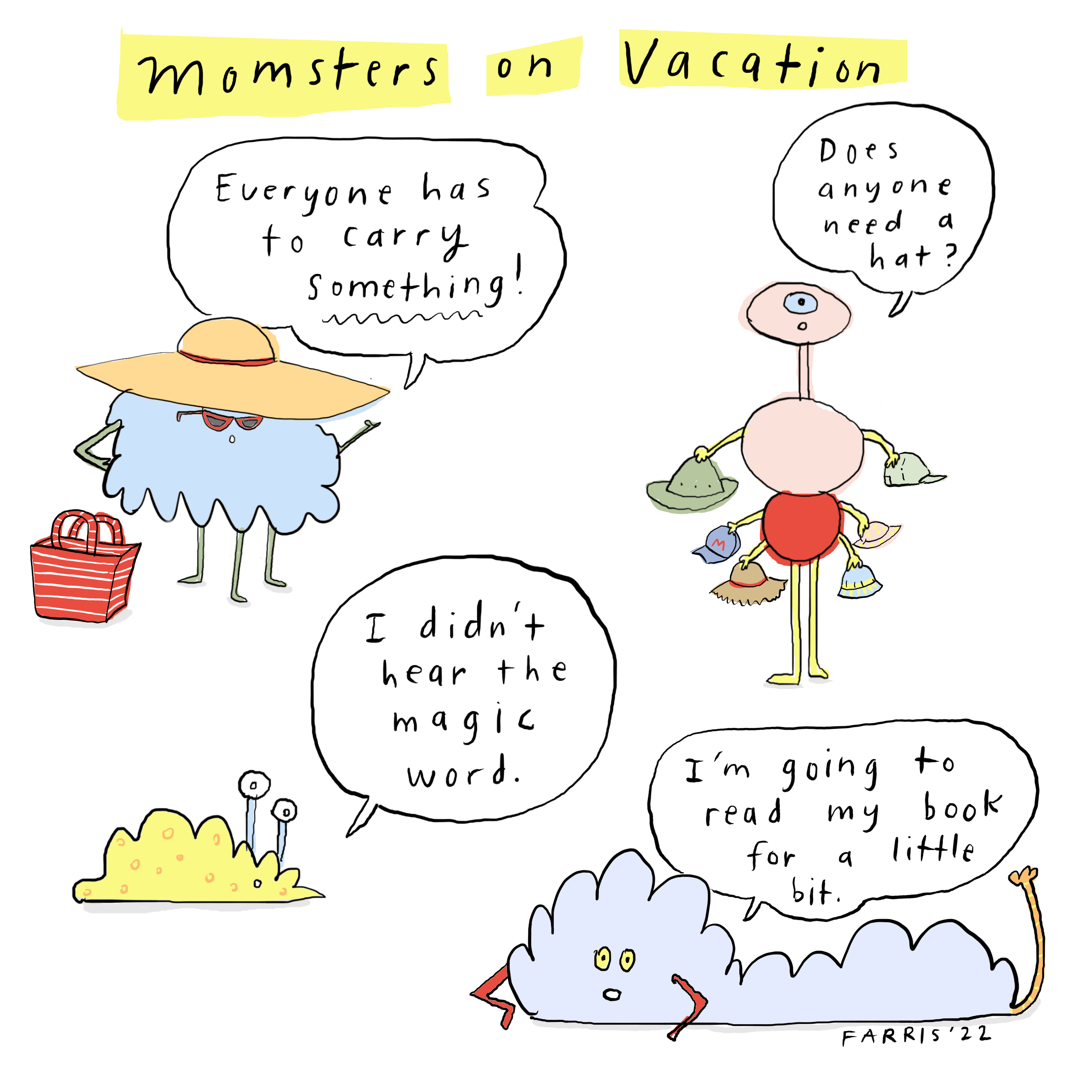 Guilty of the hat momster, while wielding a bottle of sunscreen. I also “read for a little bit” every day on the couch during the witching hour (5-6 at hour house) with varying success. This is not vacation momster, just daily life momster….