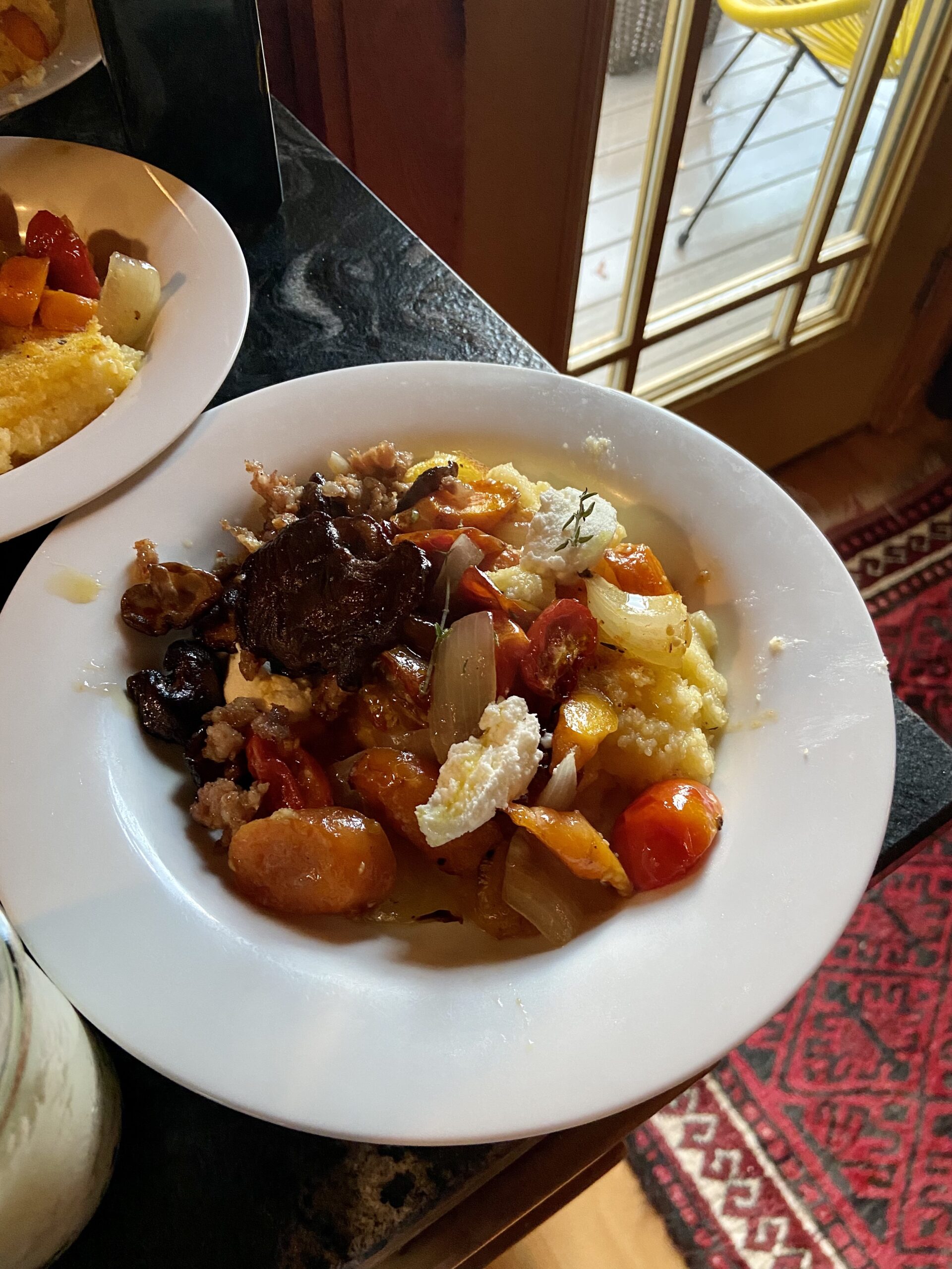 Polenta is a good thing to remember on those nights when you feel yourself slipping into the I-guess-we’ll-have-pasta-again mode. Once I committed the ratio of liquid to cornmeal to memory (4:1) it became even easier than pasta. Bring your liquid (broth, water, or a combination) to a boil, then add cornmeal in a steady stream, stirring all the while, and lowering heat to a simmer. Stir until polenta is the consistency of cream of wheat and pulls away from the sides, about 12 minutes. Drizzle in cream or add butter and cheese, and top with a little cheese (ricotta or chèvre) and any roast vegetable you’d like. This time of year, I go with tomatoes, mushrooms, and onions. Bonus points for mixing a handful of raw corn kernels into the polenta.