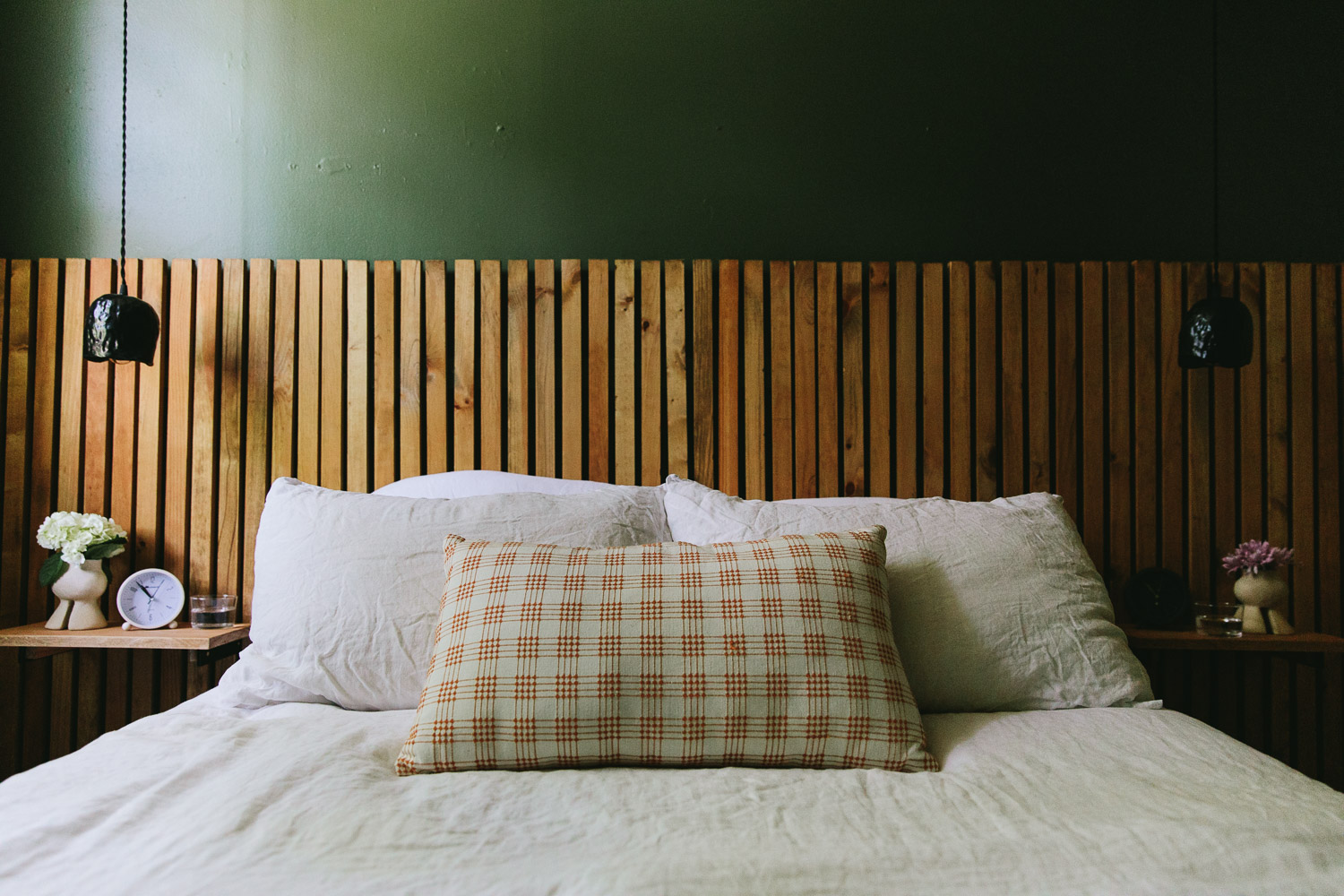 On a homemade headboard: Jack and I made the headboard. We’re a good team in that I’ll design things and Jack will bring my ideas into the physical world — I do the design and he makes it happen! He cut all the slats to size and put them onto boards and then installed them on the wall. The side tables are connected, and I made the lights out of porcelain. It’s so cool seeing my work suspended in the air and the shadows around them.