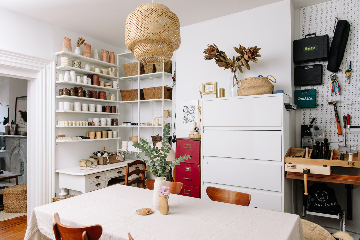 Pendant light: Flkisnuas. To Care Print: Raniban. Pottery: Grace Cady. Chairs: West Elm. Filing Cabinets: Big Reuse.