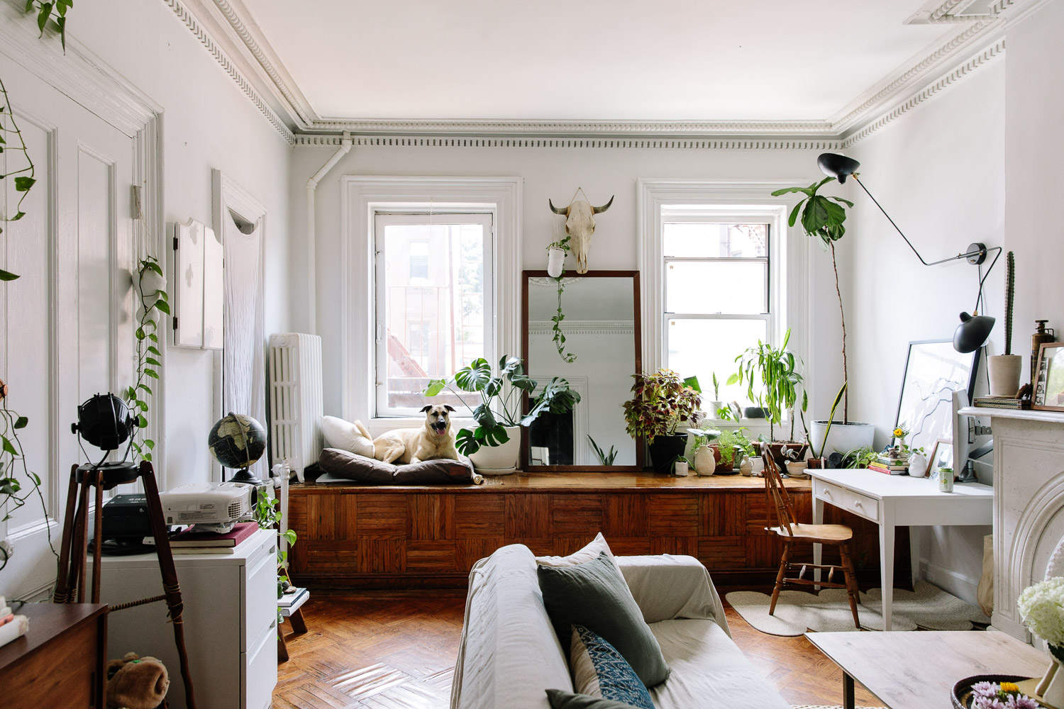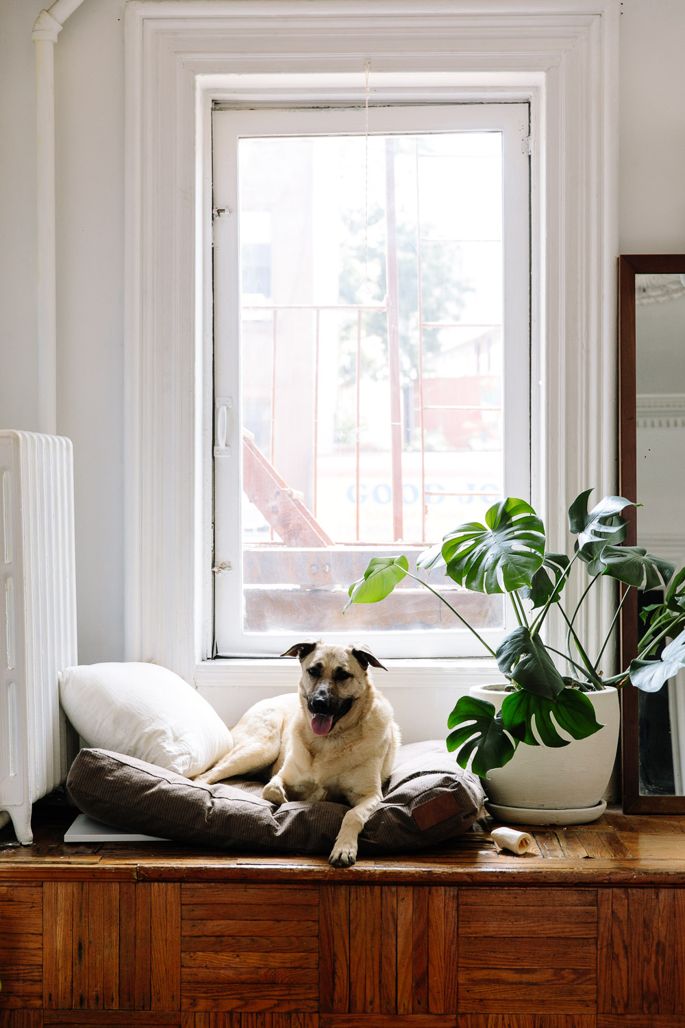 On open windows: We don’t have any curtains because we’re big on natural light. When people come to stay, like my parents or brother, we’ll give them our bedroom, and we’ll sleep in the living room. They’re always like, do you have any curtains we can put up? But we’re one story up so people walking by on the street can’t see in, it’s only our neighbors across the way. Living in NYC, we are used to it and just don’t care!