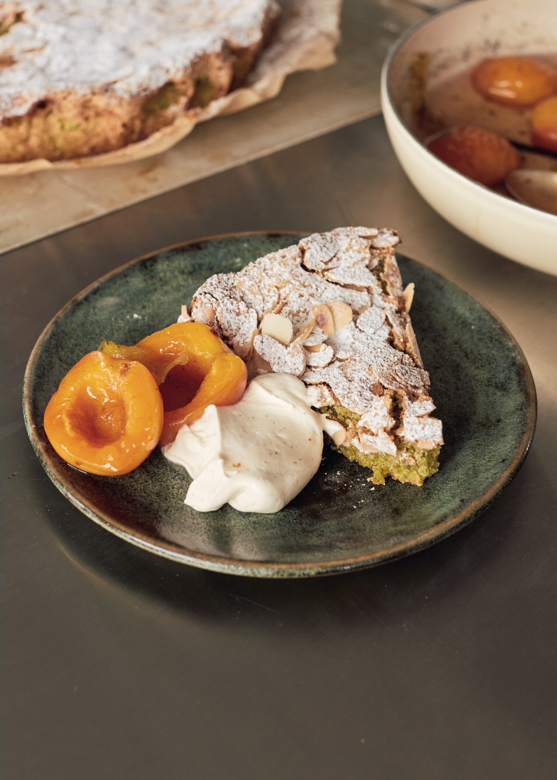 The cake is from Extra Good Things, by Noor Murad and the Ottolenghi Test Kitchen team, a book dedicated to the idea that creative pantry diving and surprising finishing touches are what take a dish from good to great. This recipe, inspired by Noor’s mother, includes optional elderflower apricots, instructions for which you can find in the book. In Noor’s headnote, she suggests adding a splash of amaretto to the cream “to make it more grown-up.”