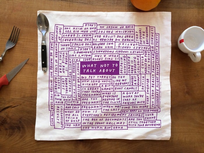 And remember these dinner conversation napkins by artist Tucker Nichols? His suggested topics made me laugh, including “what I know about cheese,” “mosquitos do/do not like to bite me,” “food you used to like,” and “for the last time how daylight saving works.”
