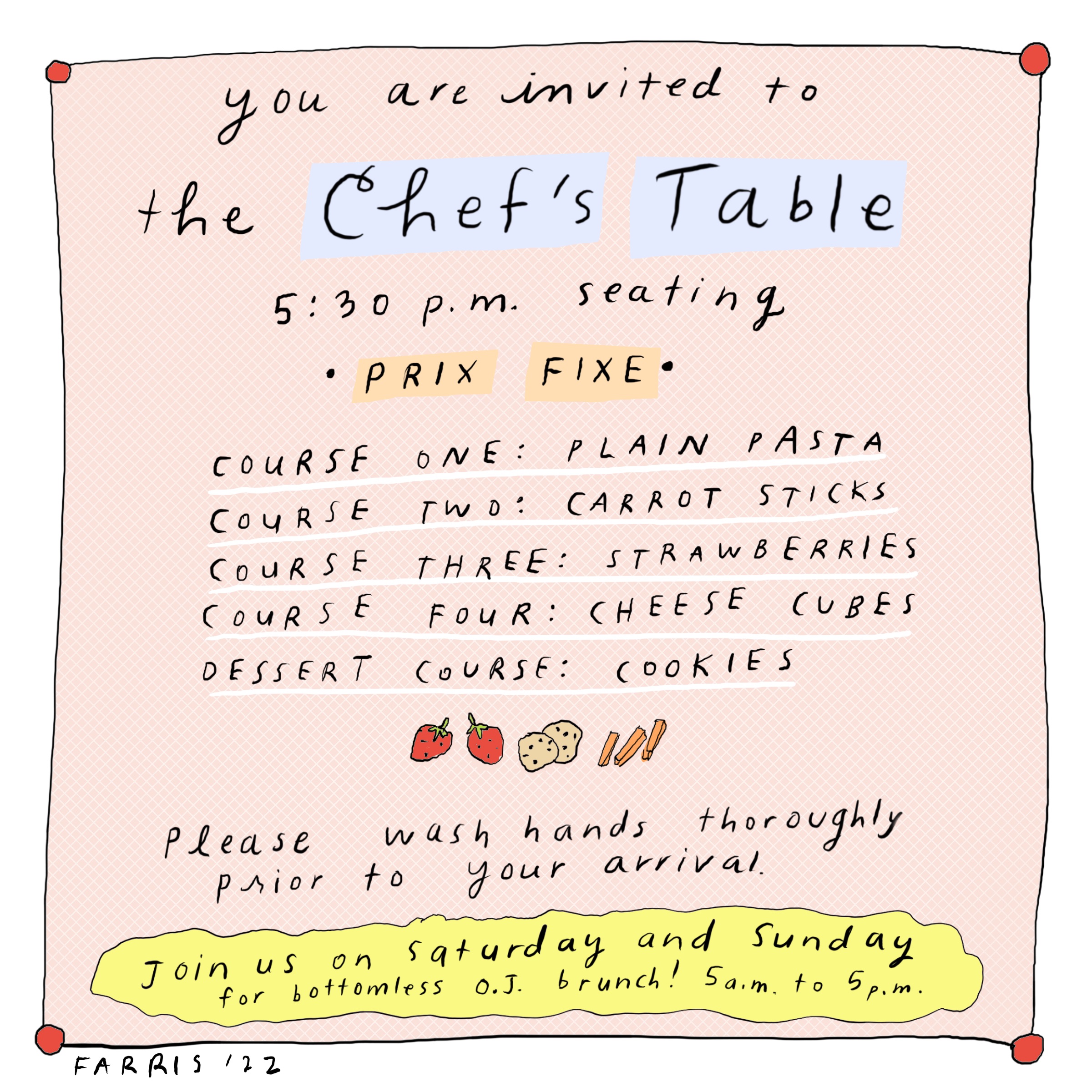 haha this is great. maybe i’ll draw up a menu for the nights when i serve a random assortment of items and serve it course by course! I think my kids would get a kick out of it!