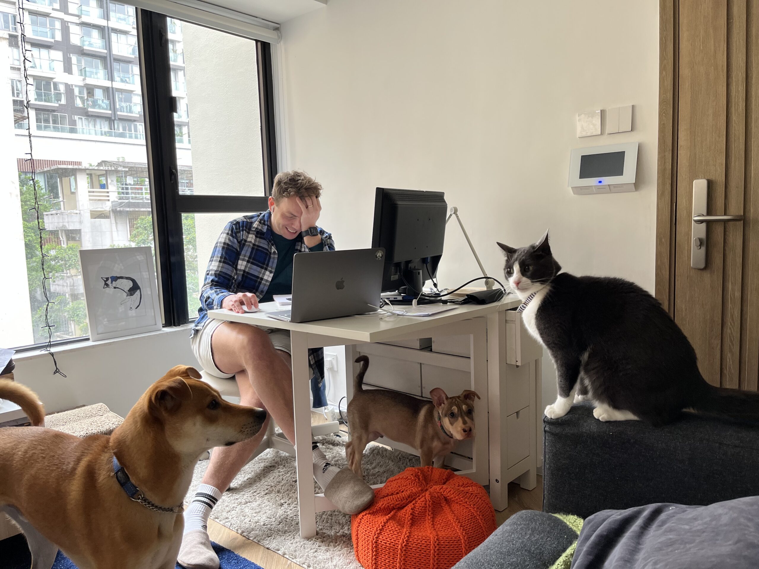 “We already have a dog (Wally) and cat (Potato), but my husband and I also foster dogs while working from home. Pictured here is what we refer to as ‘Potato’s Town Hall,’ in which he makes a case to send everyone back to the office.” — Miki