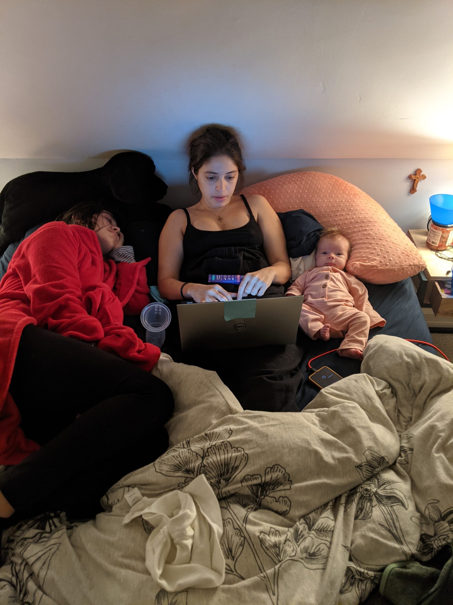 “In 2020, I was a new mom, working, and attending graduate school part time to get my master’s in public health. Here, I’m writing my final paper. To the left is my sister/roomie/all-around badass who had just worked a night shift as a resident physician, plus my trusty haakaa breast pump. To the right is the adorable tiny human I made. Not pictured is my mom, who flew up two weeks after baby girl was born to make this all possible.” — Georgia