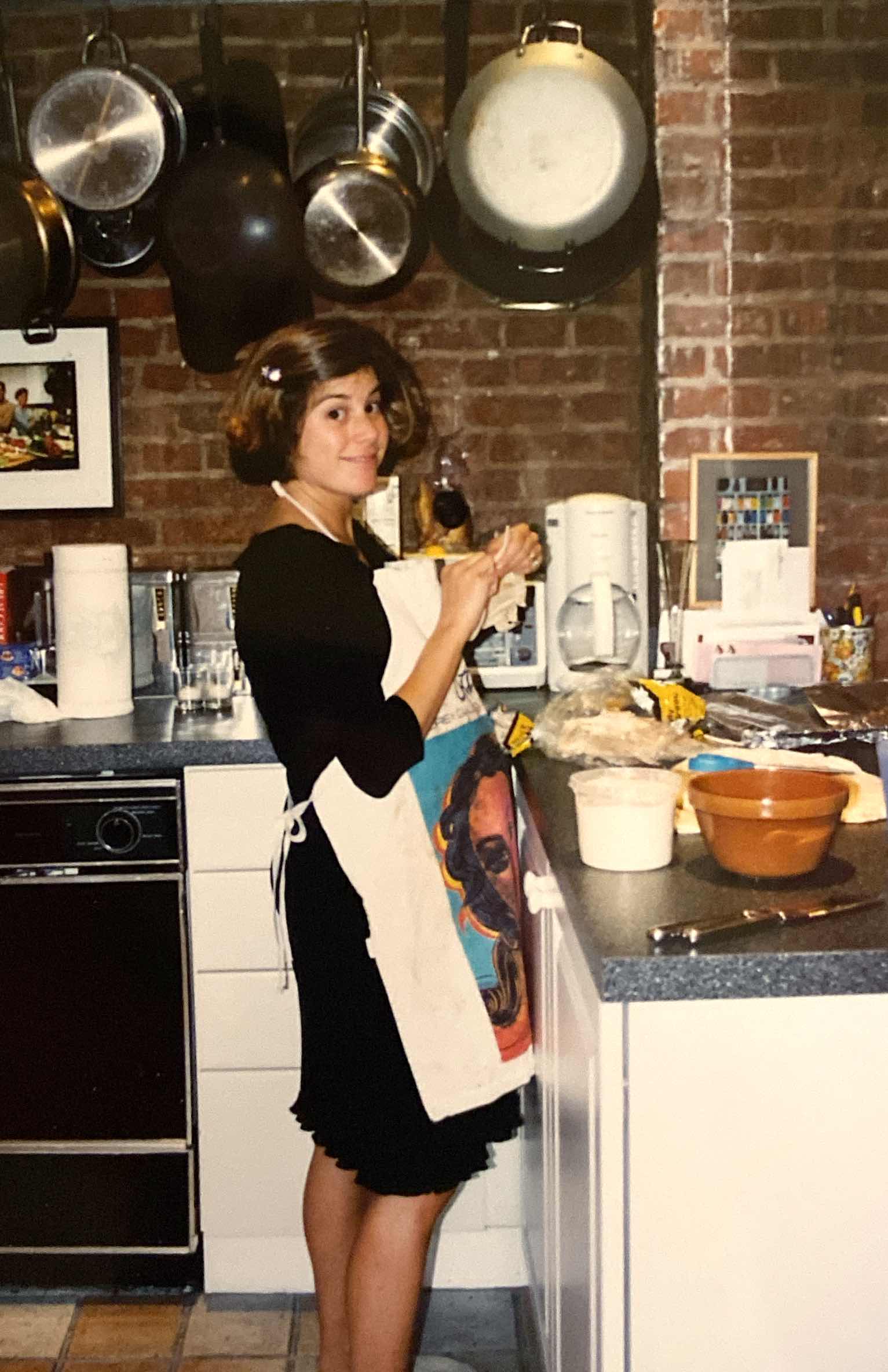 (Photo: Me in Brooklyn, December 2001, pregnant with my first daughter, trying not to mess up hummus and pita.)