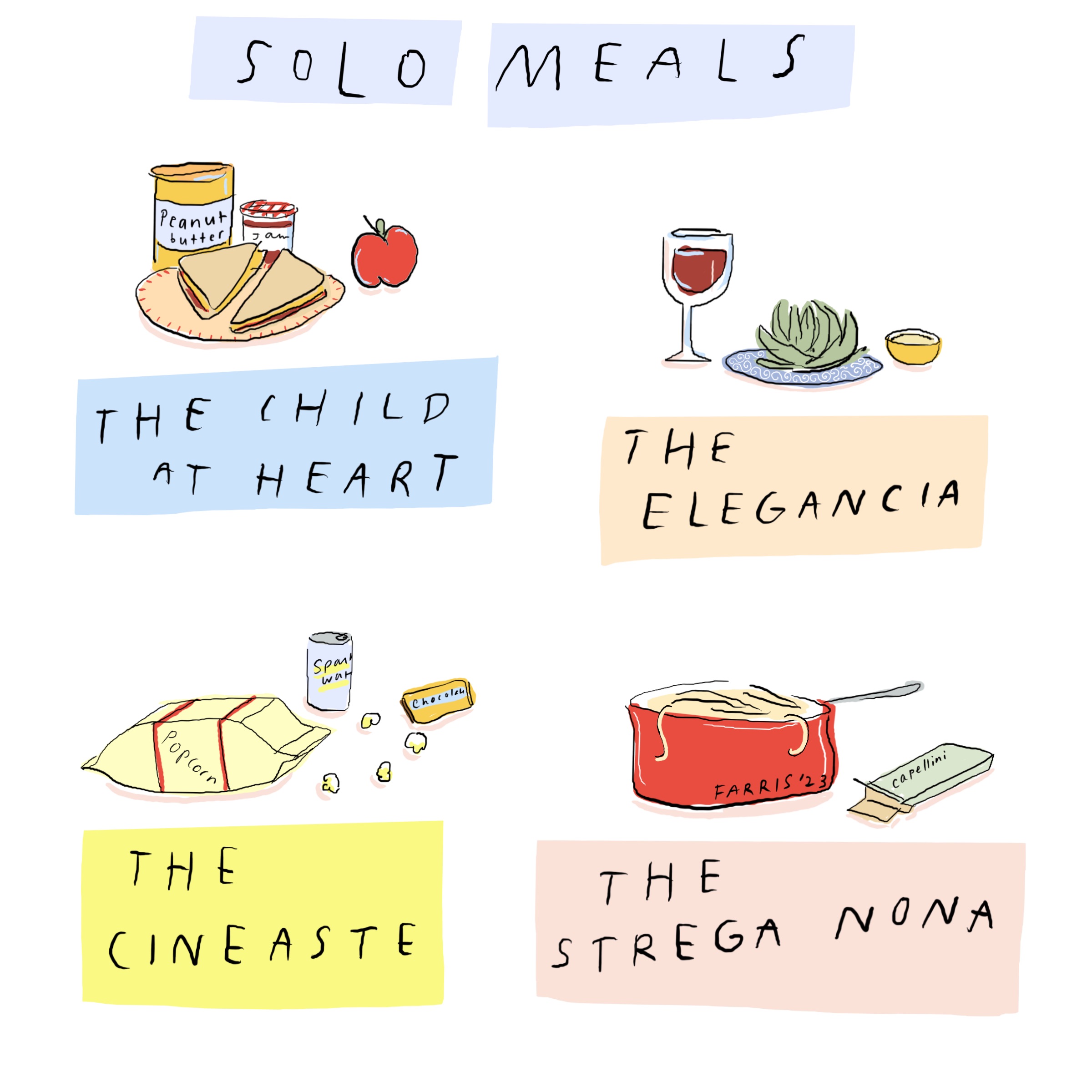 I miss dinners alone!!! My favs:1) A small cheese and herb omelette with whatever greens are around. 2) A plate of cacio e pepe. 3) Roasted brussel sprouts with red pepper flakes and a ton of pamesagne.