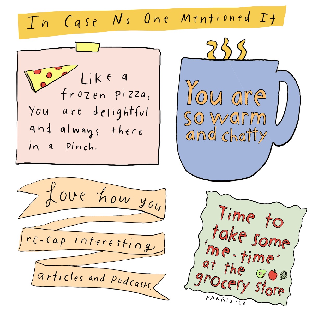 Thank you for the affirmations. I feel like I have been needing to hear “you are so warm and chatty” lately as I have been feeling very self-conscious about talking too much (some feedback I have received from some of the people I spend the most time with). I have been on a journey of self-discovery thinking about this. Sometimes an internet stranger says just the thing you need to hear (to an audience of many many thousands, but it lands).
