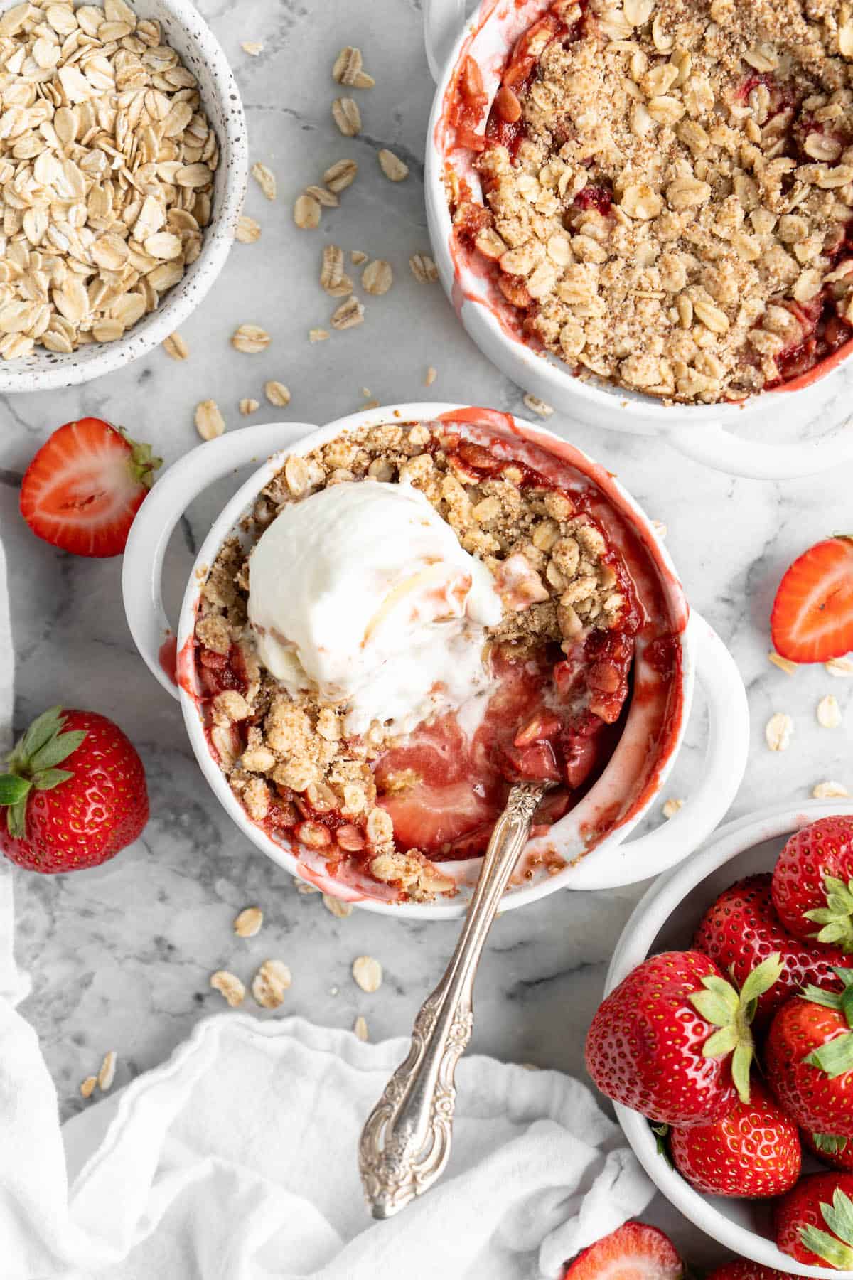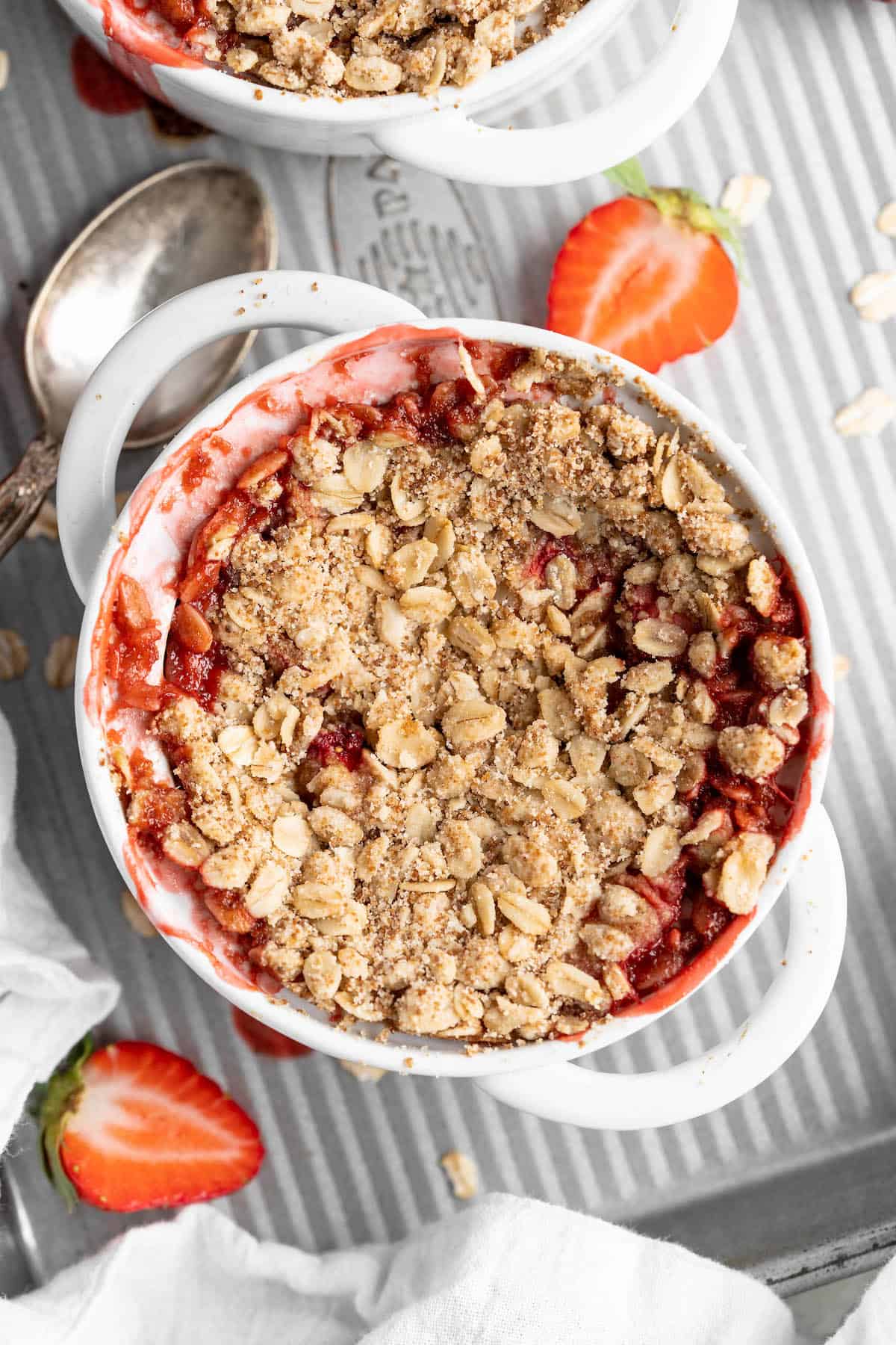 Divide the strawberry mixture evenly between two ramekins. Top with the oat mixture, dividing the topping equally between the two ramekins.