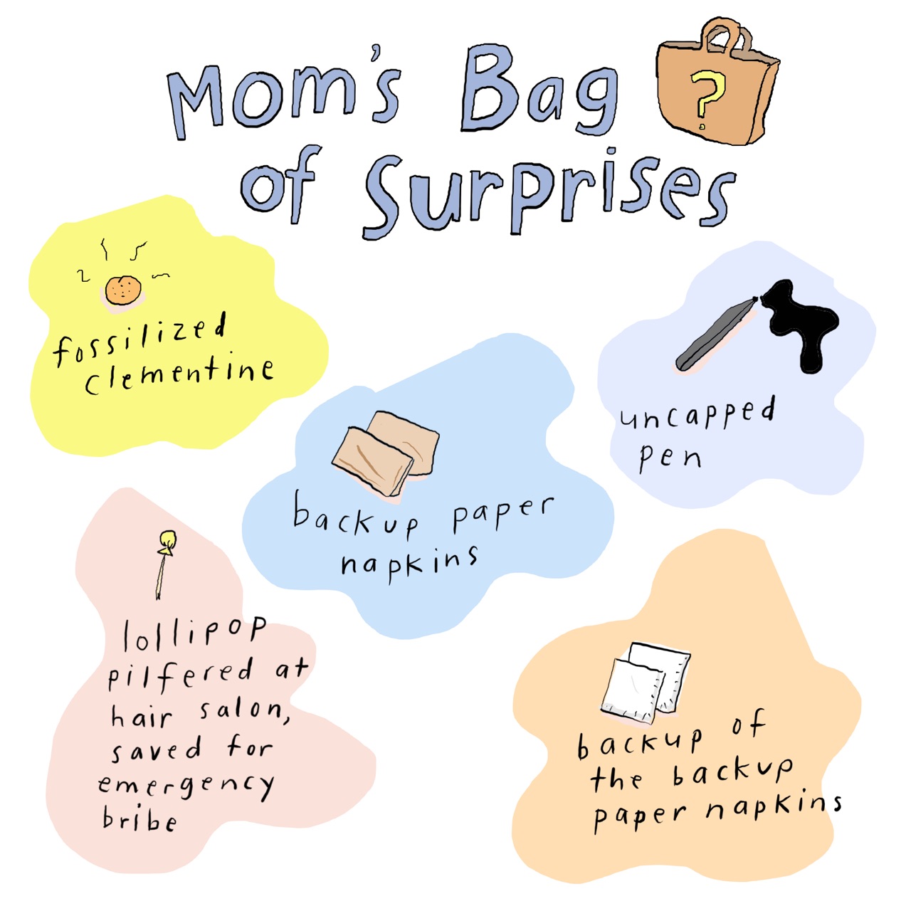 The fossilized clementine is so so real! I pull them out of my daughter’s swim bag all the time, too. And like another commenter, the napkins on napkins make me feel seeeeeeen.