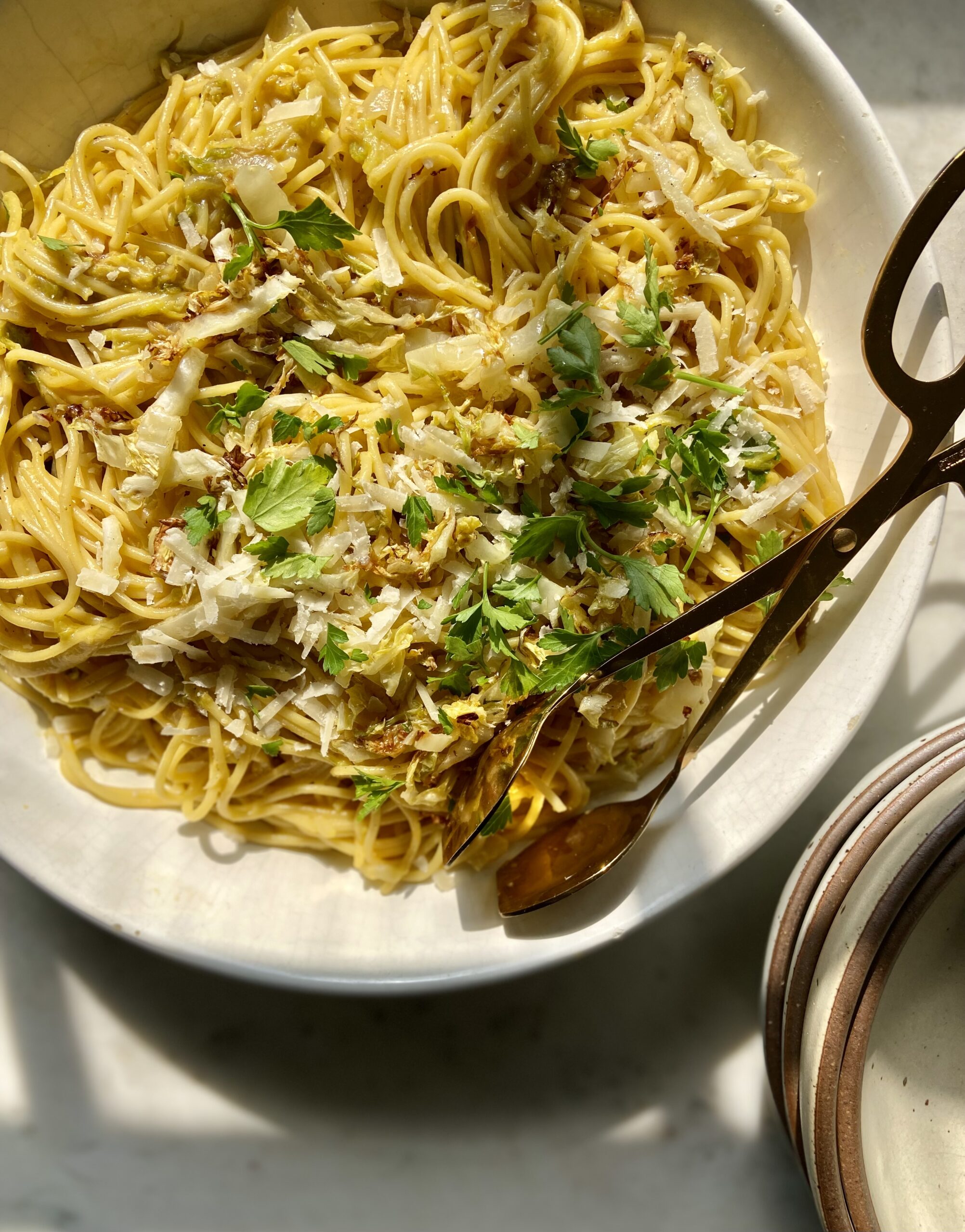 From Hetty: “Clearly this is not your classic carbonara — there’s no pork, but there is sweet, earthy cabbage, which cooks down and becomes jammy and unctuous. I add a little pasta cooking water to my eggy mix to loosen it up — this also tempers the egg so it doesn’t scramble when it is applied to the hot pasta.”