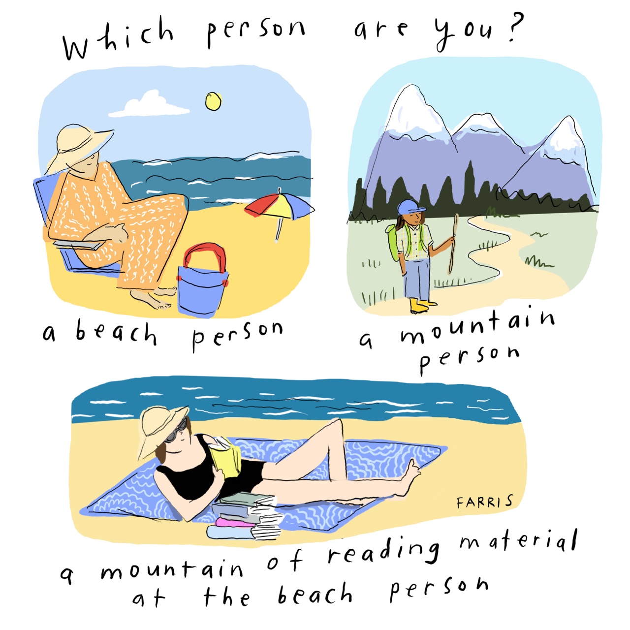 I’m a hike-a-strenuous-mountain-trail-in-the-morning-and-lounge-on-a-sandy-beach-in-the-afternoon kinda girl. And in the evening, give me a fire pit with loved ones. And always with all the books. Grace, thank you so much for giving us all the feels with your artwork!
