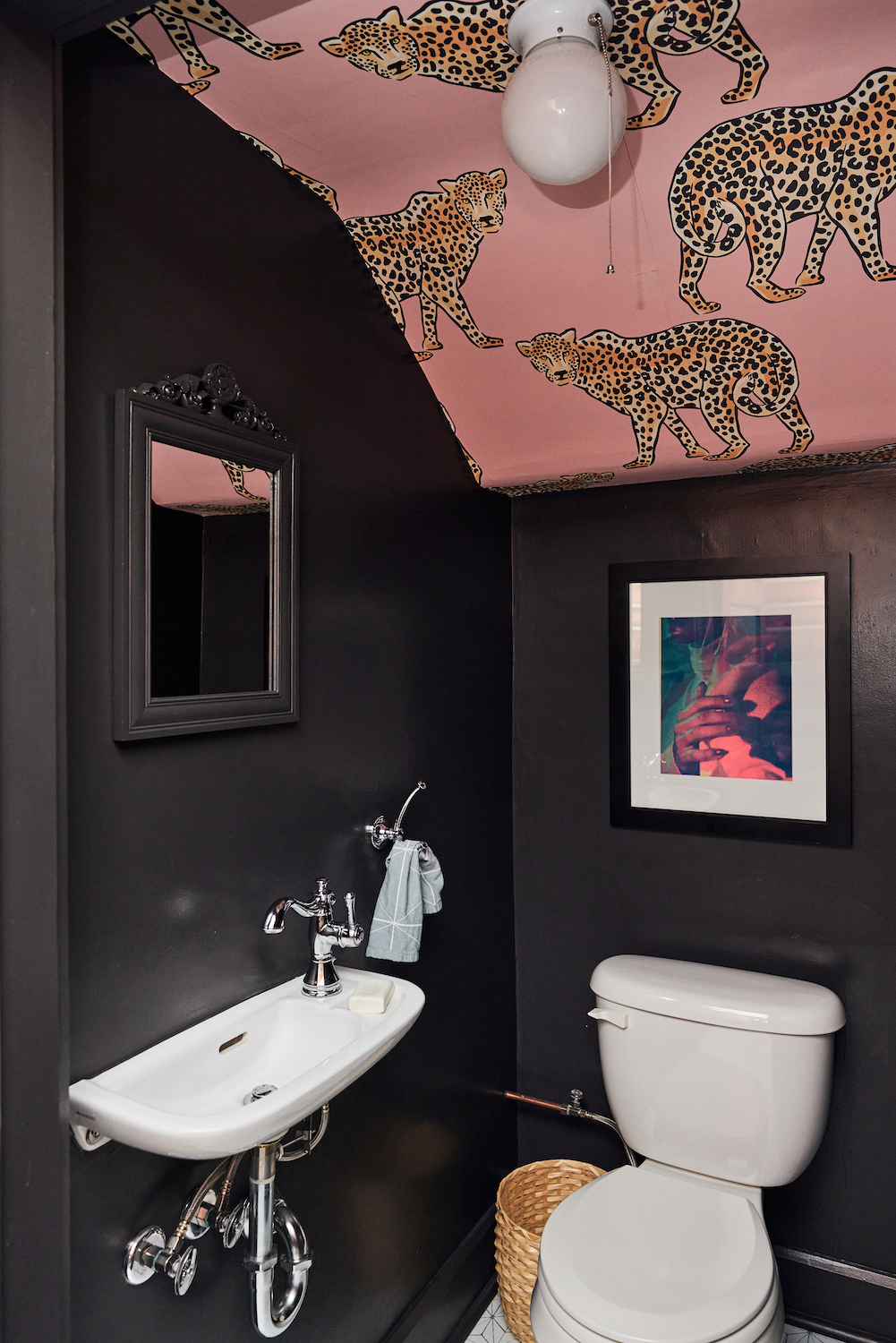 On a closet makeover: When we moved in, the downstairs bathroom was literally just a toilet in a closet. Nothing else. We tracked down the smallest sink we could find, and SL built the trim, put in the flooring, wallpapered the ceiling, and painted the walls. I know many people stay away from black in tiny spaces, but we think it makes it edgier.