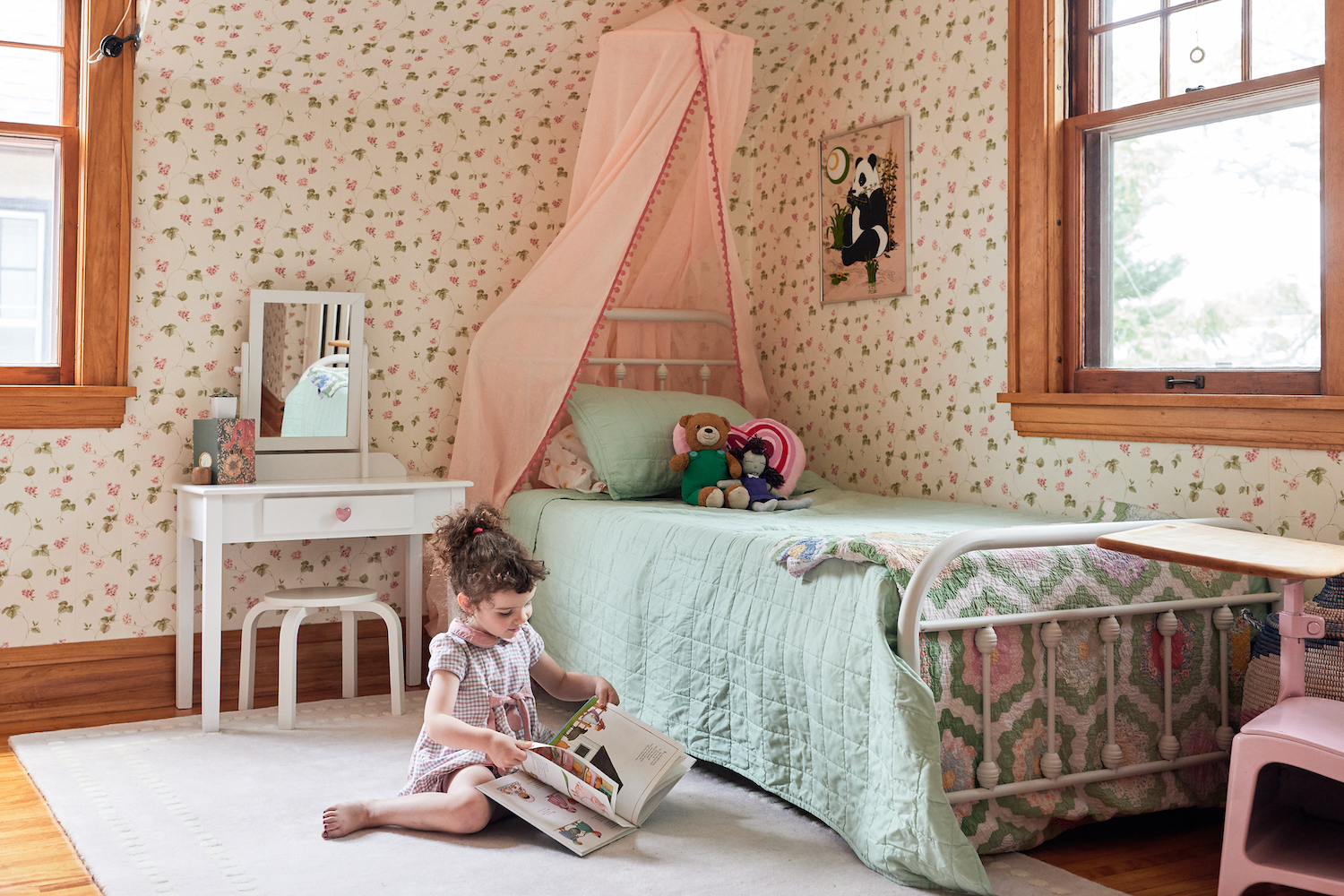 On a top priority: When it came to her bedroom, Henrietta was dying to have her own vanity, like mine. SL found this one at a thrift shop; it was adult-sized, but they cut the legs and resize it for Henrietta. So, now we both have our vanities, and she’s thrilled. We recently went away for a weekend, and she looked around the rental house and said, ‘Where are our vanities?’