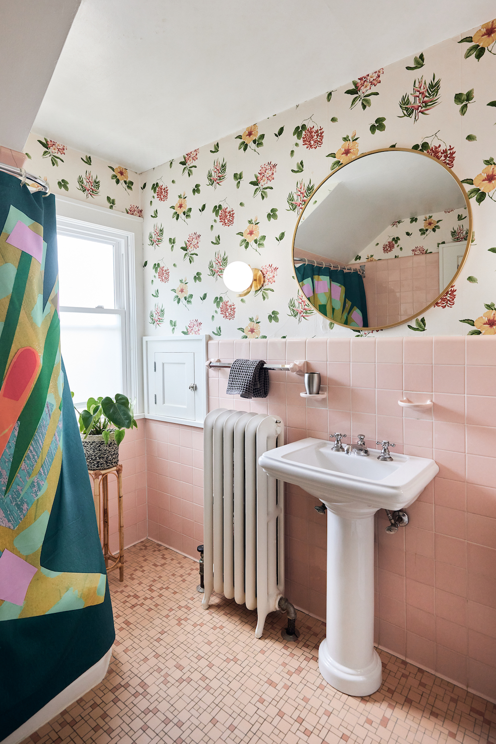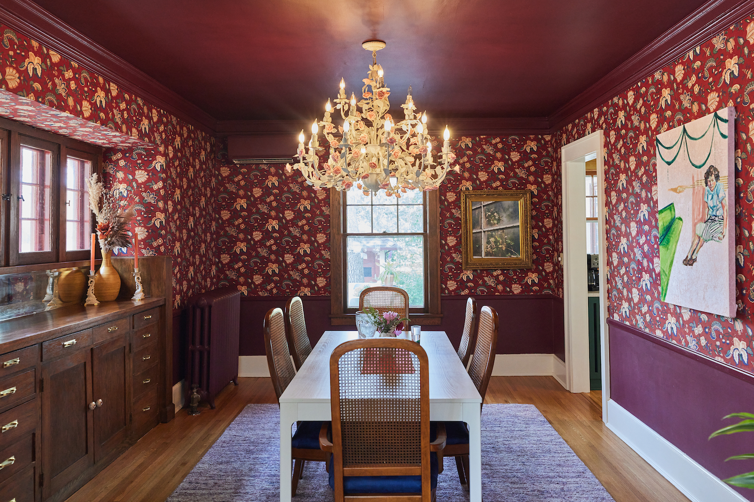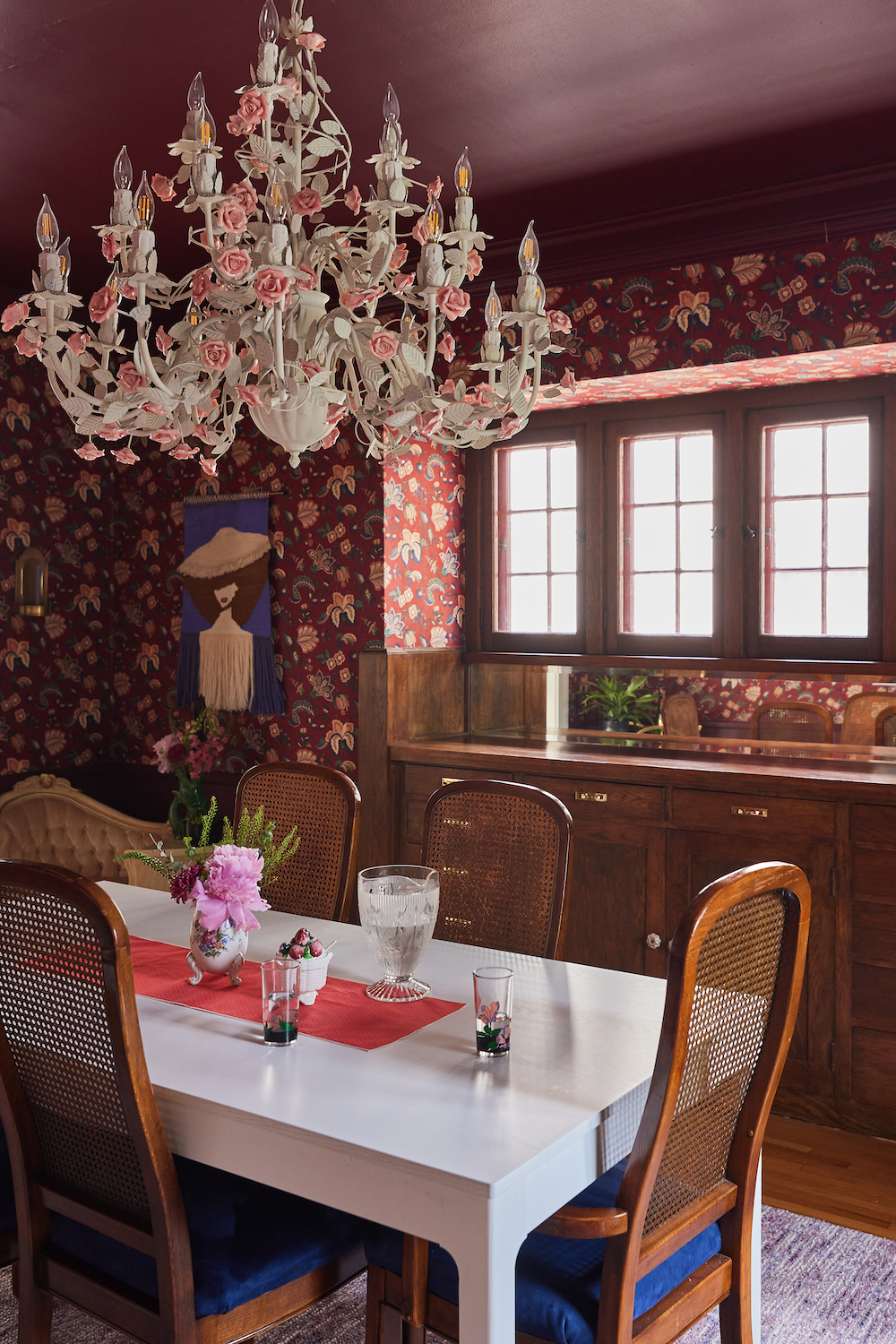 On leaning in: We decided that if we were going to keep the wallpaper, we were going to lean into the flowers. We found this French chandelier covered in roses (they all screw on individually!) on Etsy, from a lovely couple in New Jersey. It is my pride and joy.