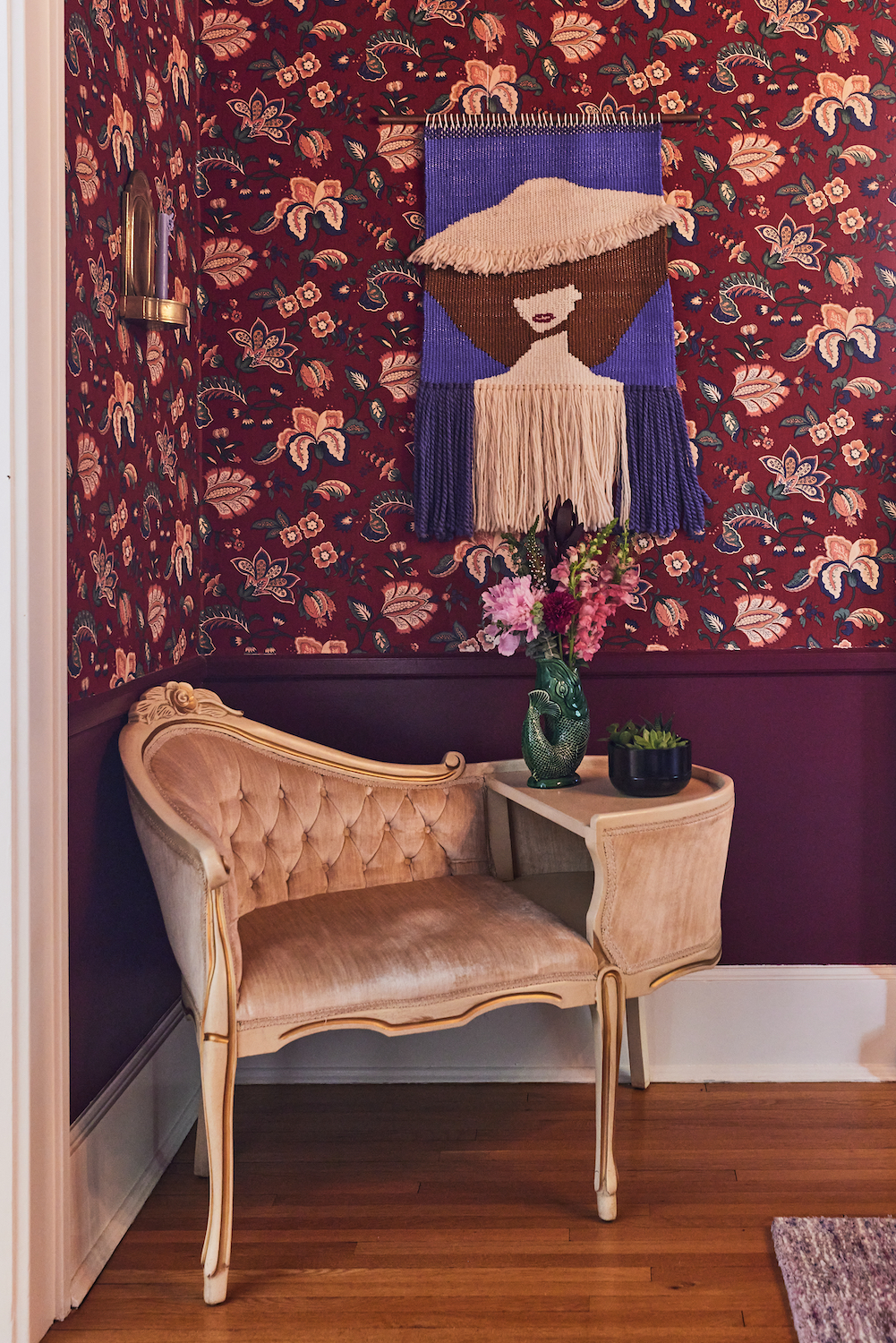 On drama: This cloth wallpaper was here when we moved in. When people came to give us quotes for painting, they all said, ‘Well, of course you’re going to want this taken down.’ I was like, ‘Hell, no!’ We envisioned throwing fabulous dinner parties in this rich, dramatic space. At the time, the ceiling was white, and the bottom of the walls were green, but we chose an oxblood paint, inspired by a color we used in our wedding bouquets.