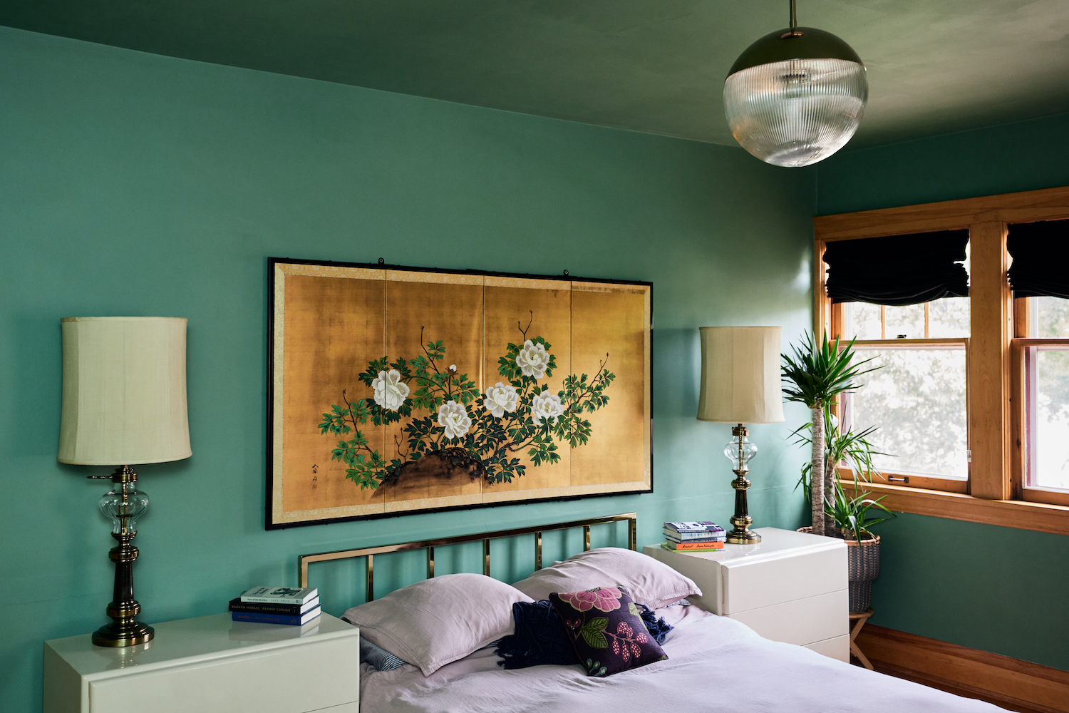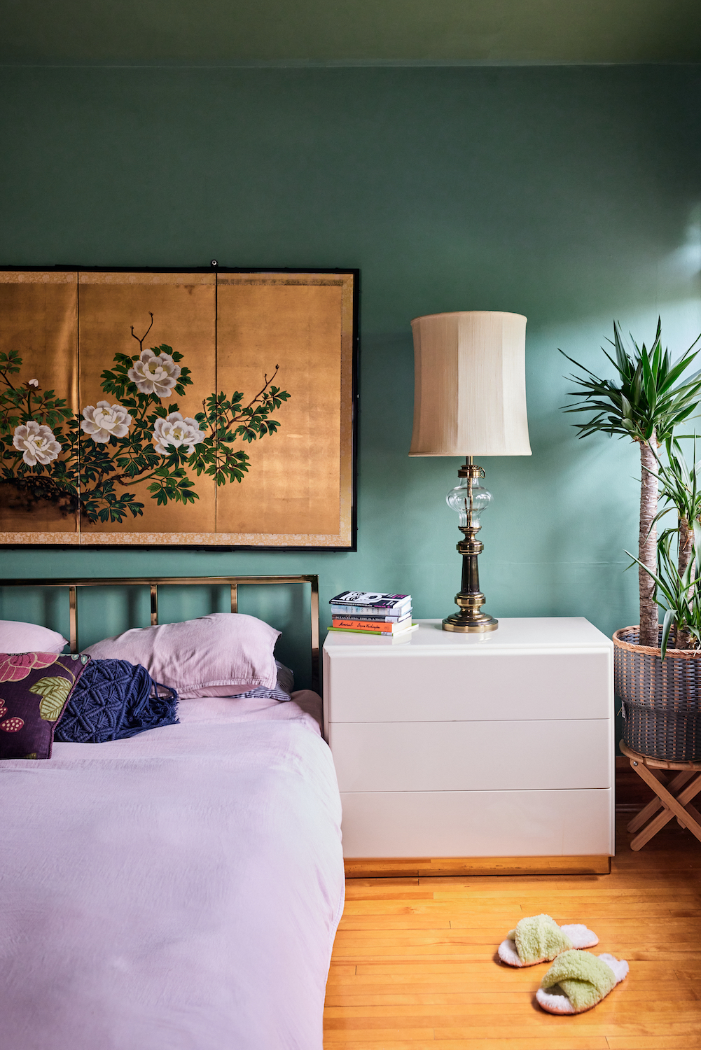 Paint: Benjamin Moore’s Lehigh Green. Light: CB2. Bed: CB2. Bedding: Crate & Barrel, similar. Planter: Ikea. Plant stand: Ikea.