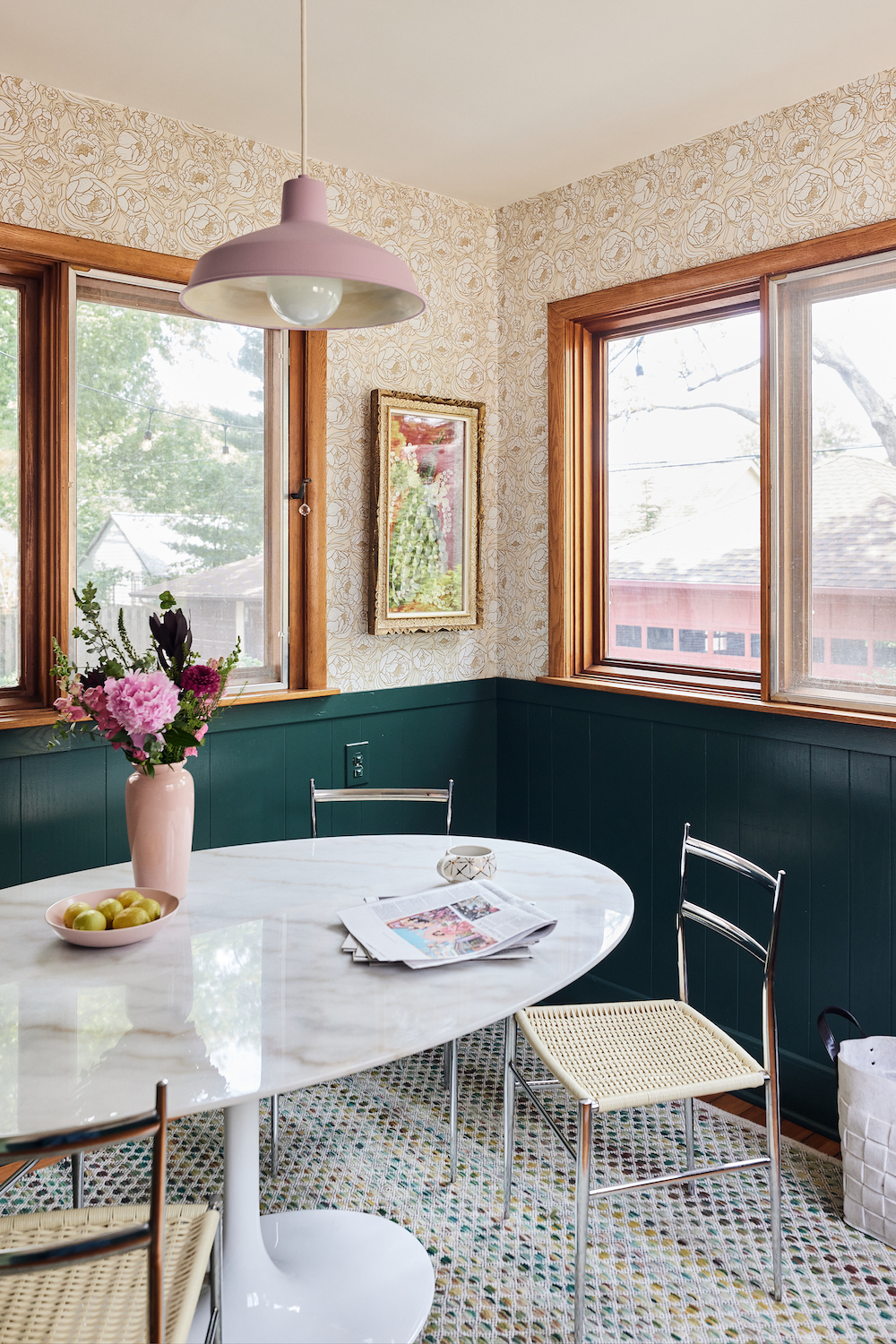 Wallpaper: Chasing Paper. Paint on paneling: Benjamin Moore’s Crisp Romaine. Table: Interior Icons, similar. Chairs: vintage. Rug: Ikea.