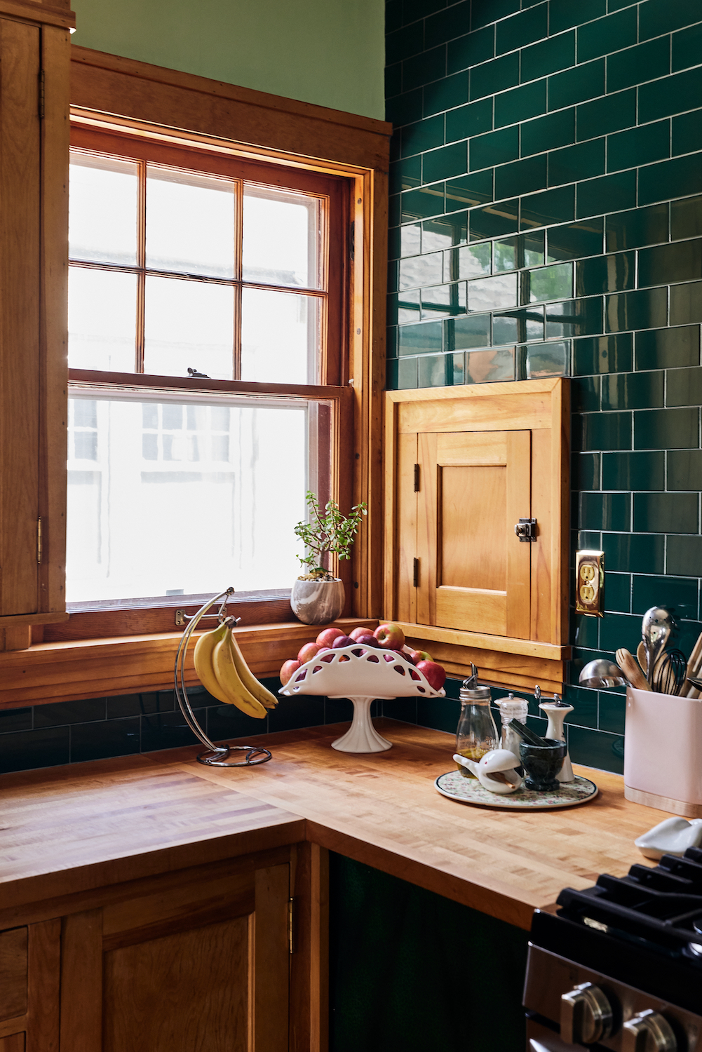 On a hidden hack: This wooden cabinet is actually a laundry chute. It was here when we moved in, and it’s so convenient for cooking, because you can just toss in all the dirty kitchen towels and whatnot, and they go right down to the laundry. There’s also one in the bathroom upstairs. We love them.