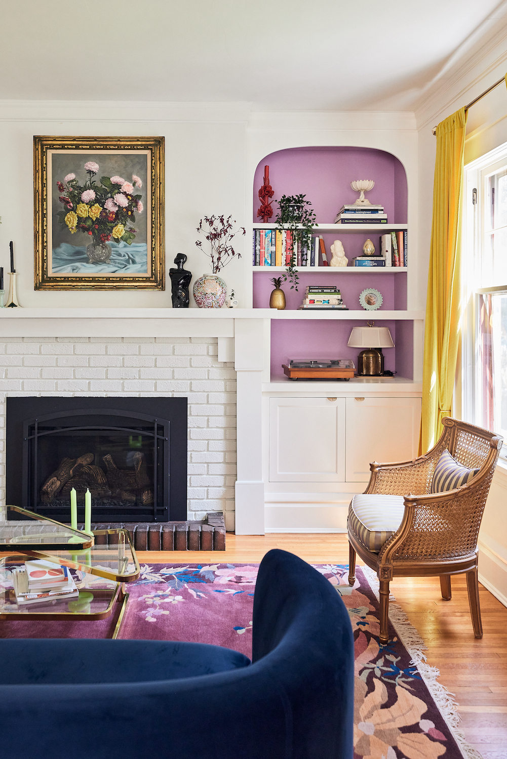 On color splashes: Before moving in, I spent a lot of time looking at house tours, many of which had neutral palettes. Following that inspiration, we started painting the walls white and instantly regretted it. It’s just not us. We quickly abandoned the white, but the living room was already done. We wanted to add color, so we decided to paint the inside of the bookcases with Benjamin Moore’s Angelina — a purple we absolutely love.