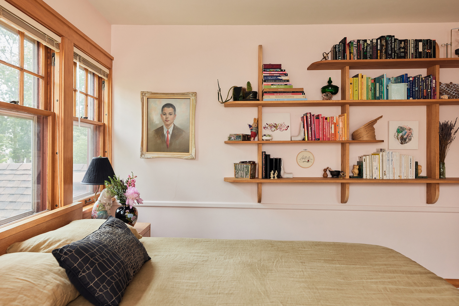 Paint: Benjamin Moore’s Cream Puff. Bedding: West Elm. Shelves: Benjamin Schleif.