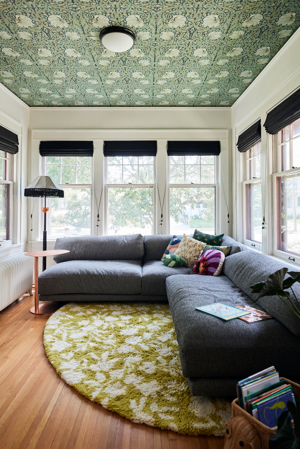 Wallpaper: William Morris for Spoonflower. Sectional sofa: Blu Dot. Throw pillows: Jungalow. Rug: Anthropologie, similar. Floor lamp: thrifted. Side table: Blu Dot. Blinds: Blinds.com.