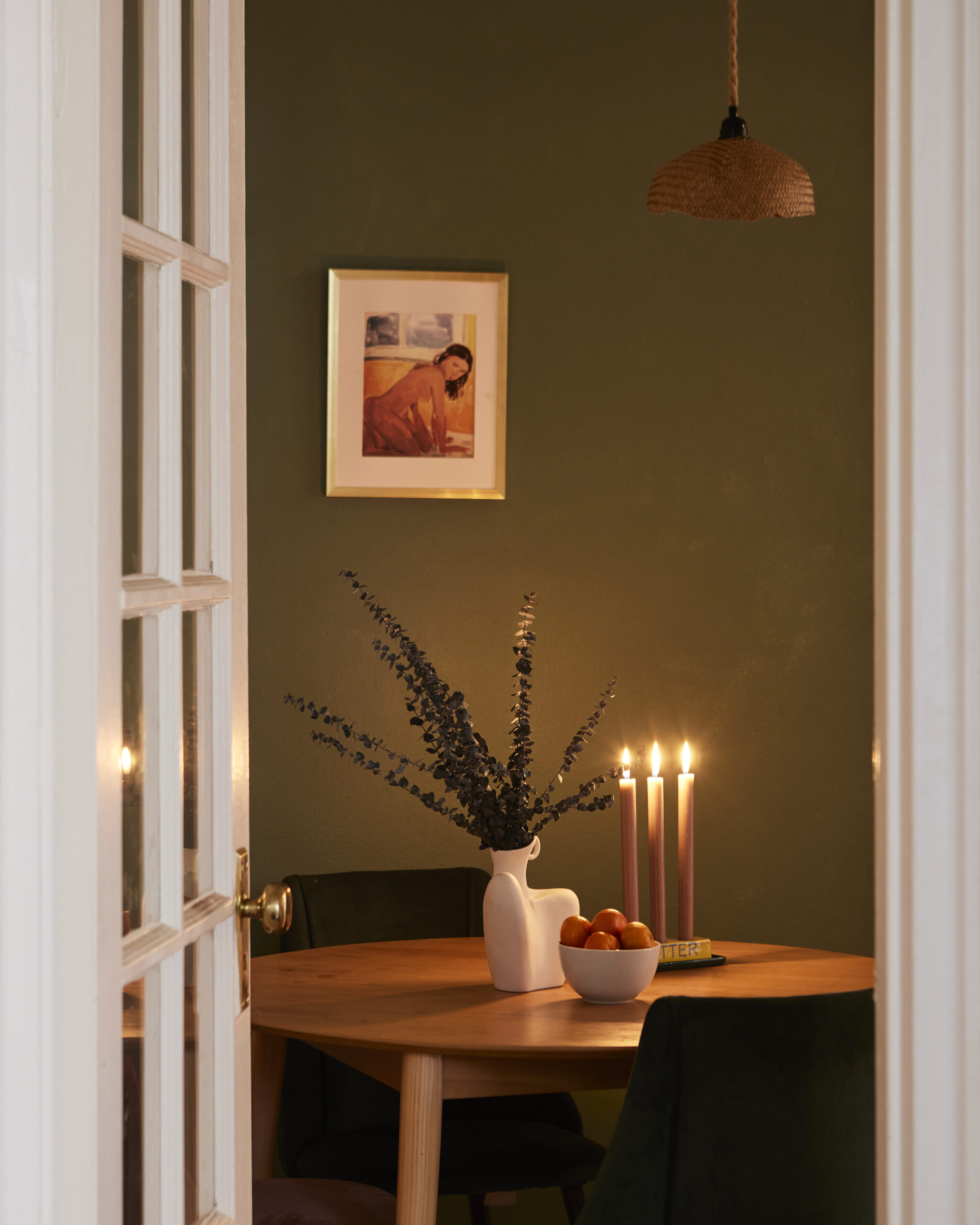 Paint: Cedar Path by Benjamin Moore. Chairs: Joss & Main. Print of nude woman: A page from Every Body. Vase and pendant lamp: gifts from friends. Candle holder: Urban Outfitters.