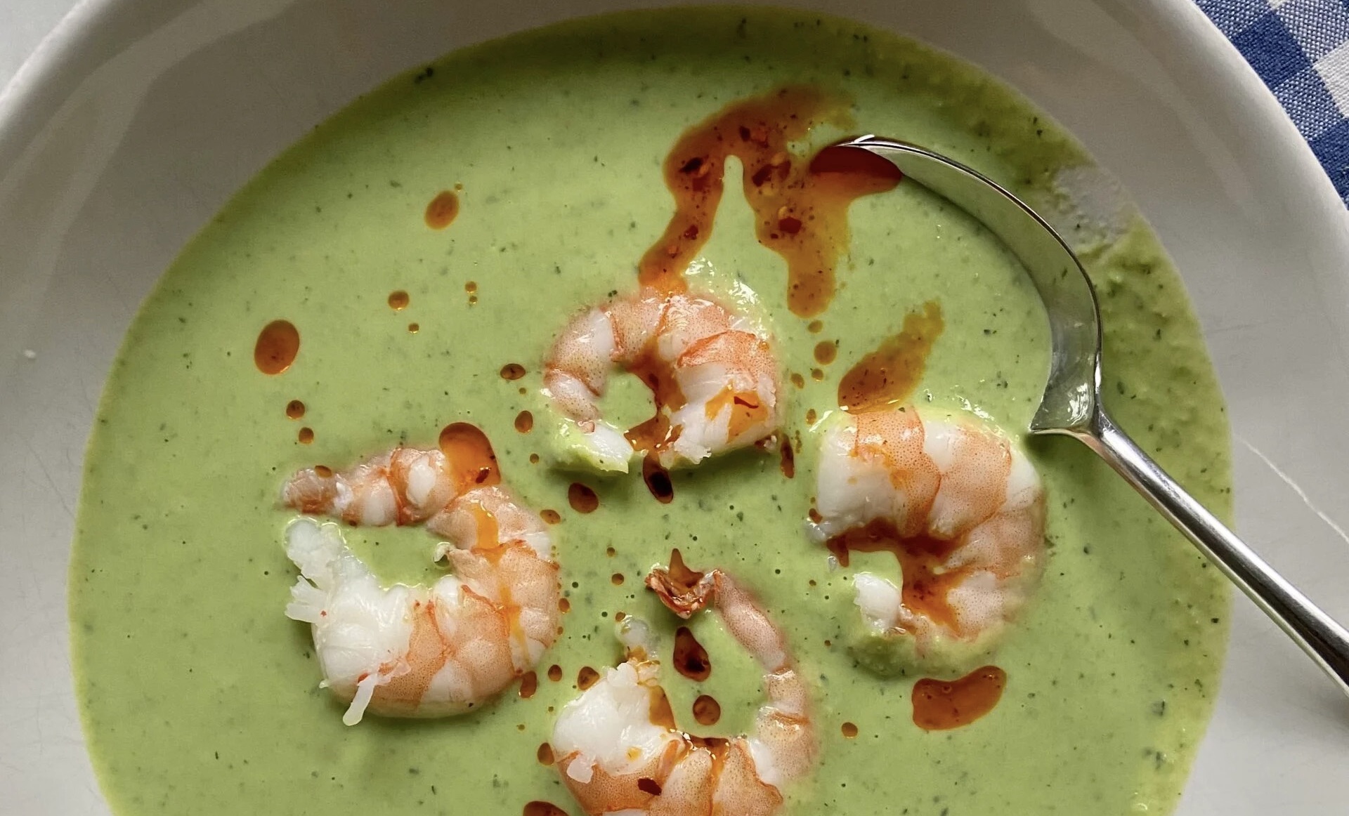Bring a large pot of salted water to a boil. Add the shrimp and cook for 3 minutes. Drain and run under cold water. Meanwhile, sauté the leek in 1 tablespoon of olive oil in a skillet placed over medium heat. Cook until soft, about 5 minutes. Place the leeks, peas, buttermilk, mint, salt, pepper, and olive oil in a blender and whirl until everything is processed and the color is a beautiful pastel mint. Taste and adjust seasonings. Add shrimp. Chill in the refrigerator (fine to do this right in the blender pitcher) for at least one hour — the colder the better. Optional: Serve topped with chili oil or any of the suggested add-ons.