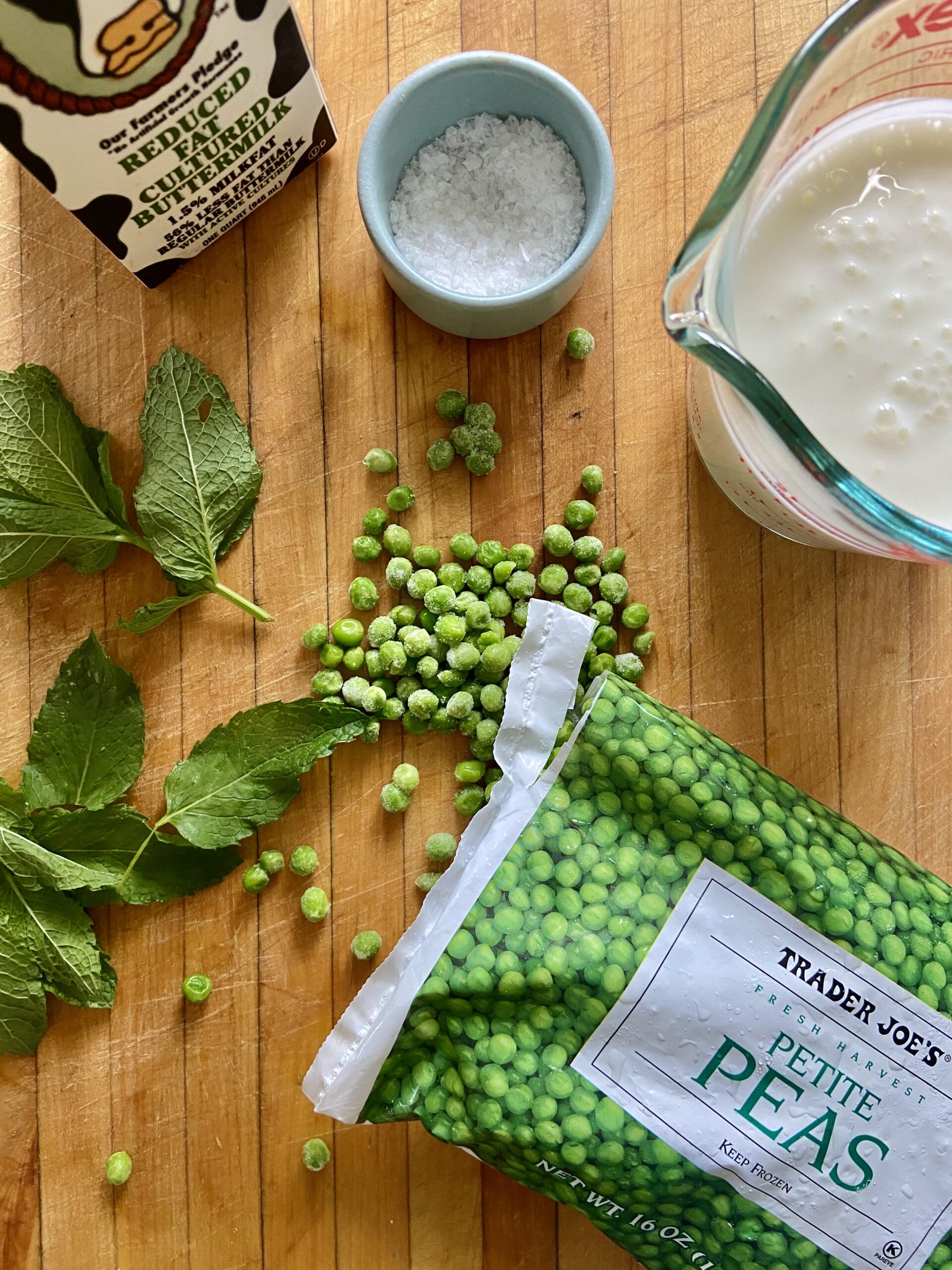 You want the peas to be somewhat thawed, otherwise the consistency is more like a milkshake and less like a soup. Also, if you want to make homemade buttermilk, go for it, it will be amazing and still fall close to the five-ingredient minimum, since buttermilk is only milk and lemon juice.