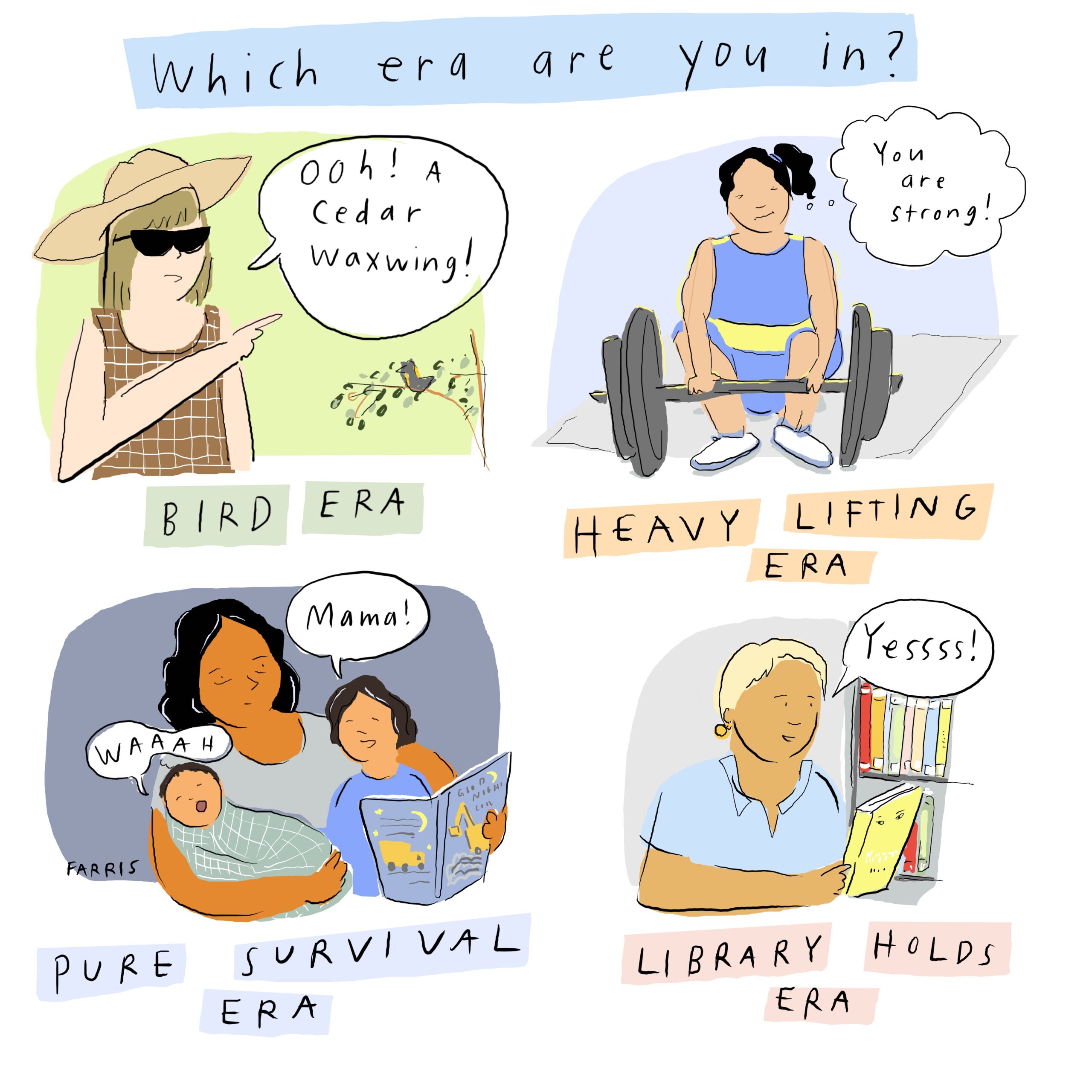 This comic actually made me gasp because I never thought I would say this, but I think I’m actually coming out of the pure survival era! Just this past week I dug out my library card and put a bunch of books on hold for my newly avid reading 2nd and 3rd graders…something I wouldn’t have even THOUGHT about doing 2 years ago. My baby is 2 now and my twins are 4 and the 7 of us are finally finding our way…and holding library books in the process!! FINALLY!