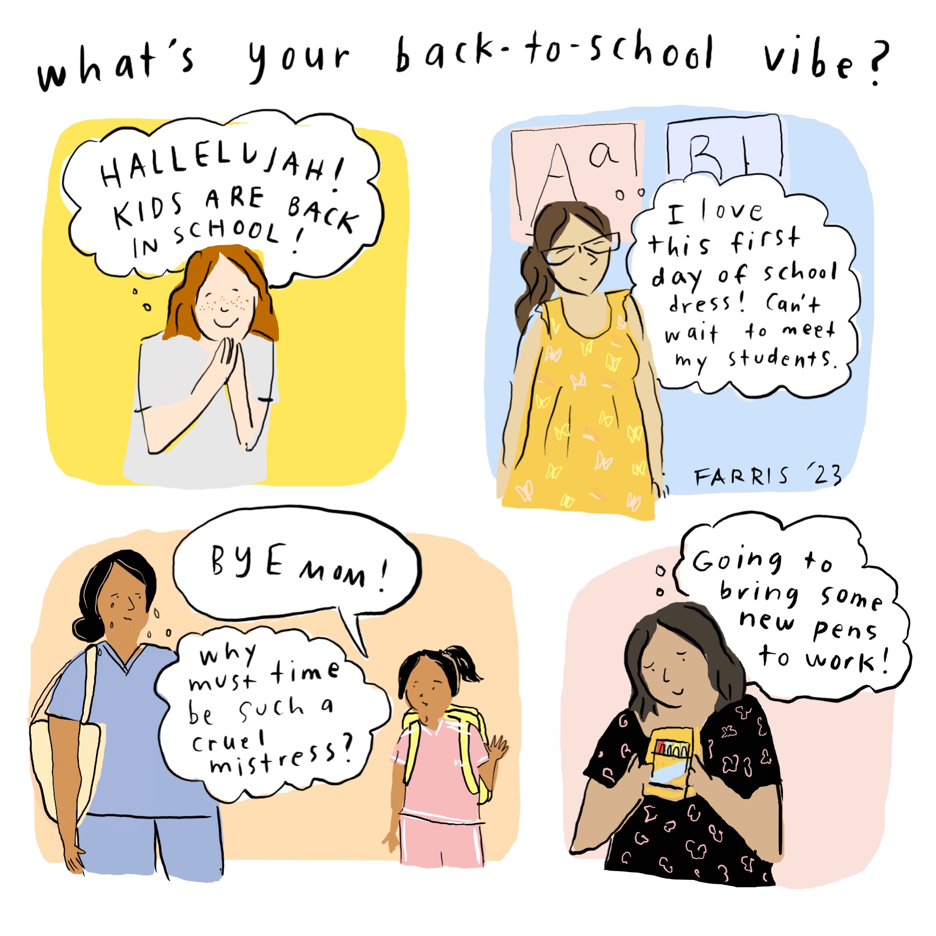 Teacher who decided to leave the profession at the end of the previous school year- feeling many feelings about the first back to school season I am not teaching in- for 10 years. But mostly the most incredible relief. Right now back to school is sort of traumatic- I can’t wait until a few years go by and I can feel excited about school supplies again like I used to. Good luck to all the parents, teachers and students. :)
