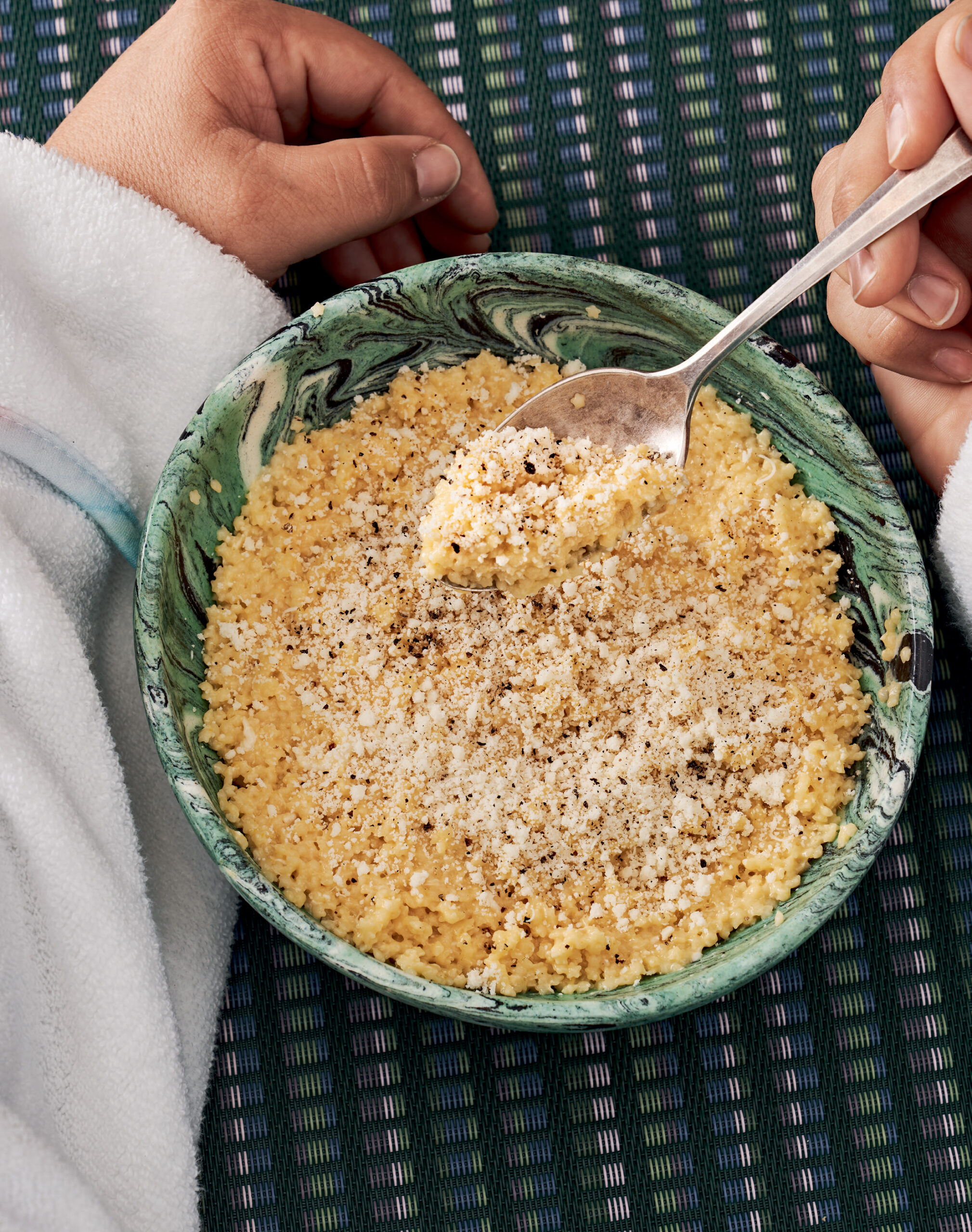 Transfer the pastina to a bowl and top with more Parmesan and a few grinds of pepper. Eat up and watch all your troubles float away.
