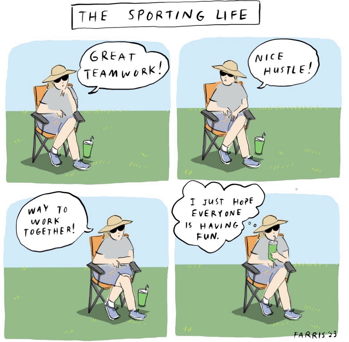 And yet! This comic, above, shows my vibe most of the time. One day I’d love to write an open letter to the coaches and parents who I’ve seen get very intense. They tear into little kids, and it feels like toxic masculinity rearing up. Who are these guys trying to impress? Why do they feel the stakes are so high for them personally? Who are they performing for? The game’s on a sunny Saturday! Let’s take the sport seriously, but maybe not get sweaty and red-faced? (Jenny said I should get this tee, haha.)