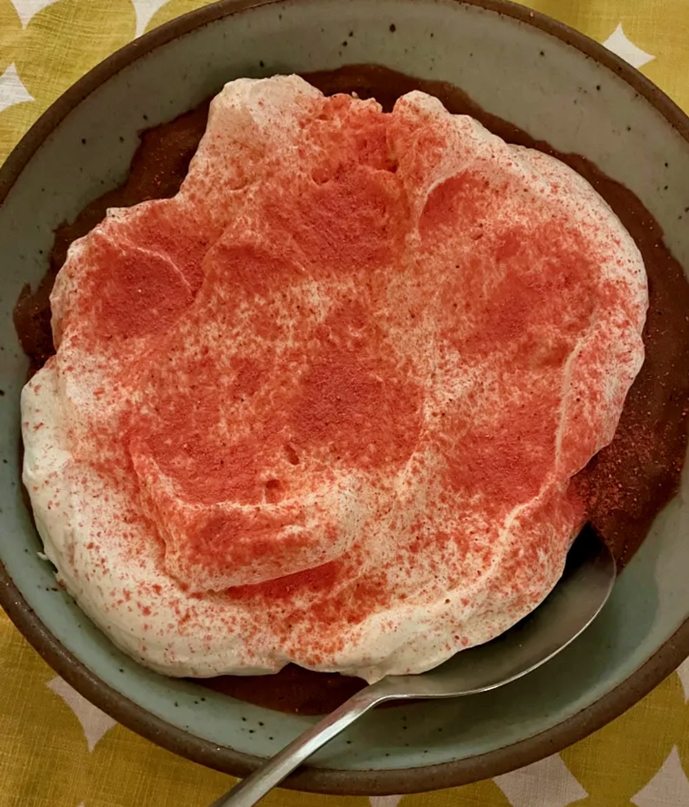 The other day, Jenny made this chocolate mousse recipe with a twist. She got Trader Joe’s freeze-dried strawberries, processed in a mini food processor into dust, and sprinkled them over the mousse and whipped cream. So tart! So good!