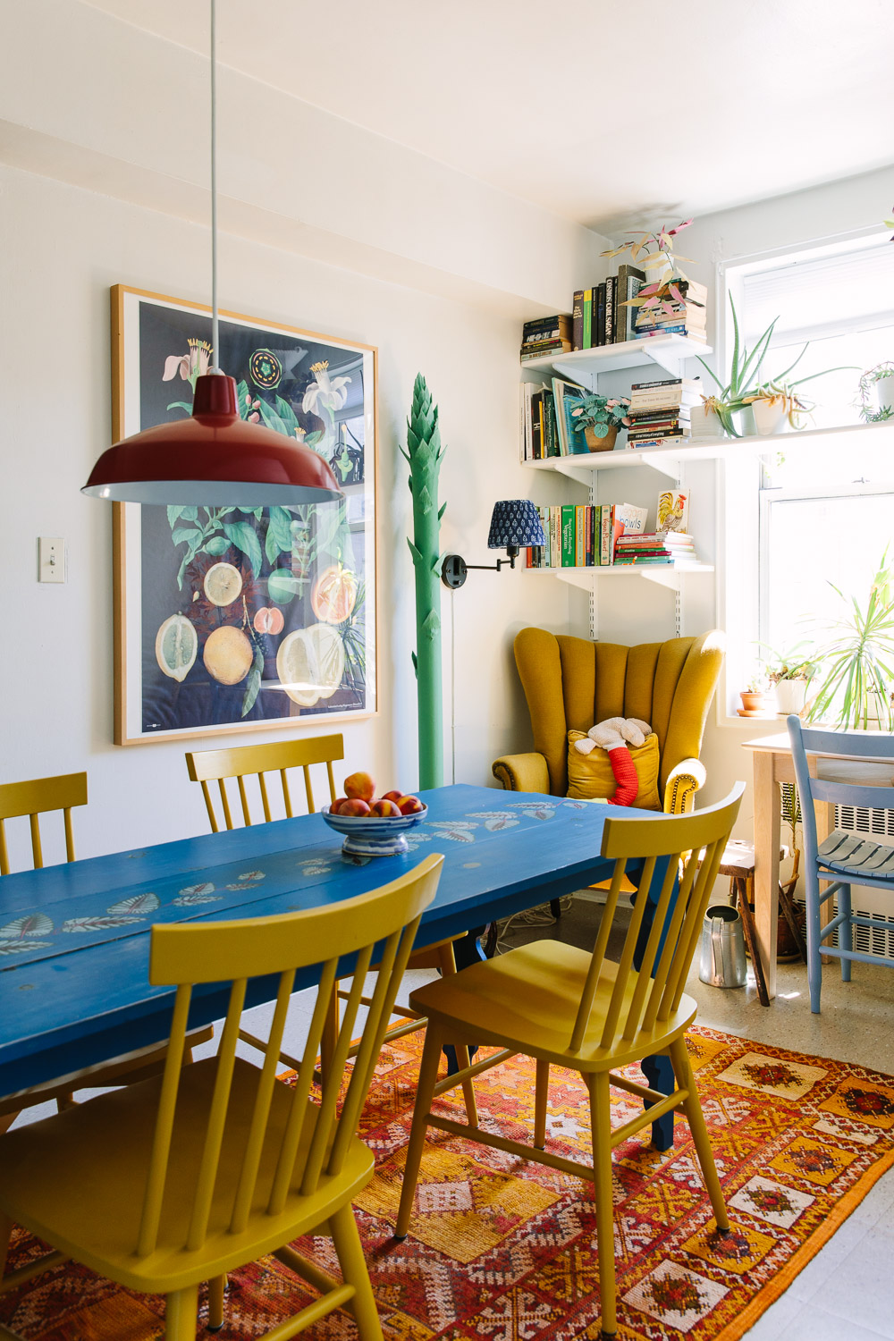 Dining table and asparagus: made by Corrie. Chairs: Target, similar. Rug: inherited. Yellow armchair: thrifted, similar. Pendant light: Red Barn Light, similar. Fruit poster: Evolution. Blue sconce: Amazon, shade by Etsy, similar.