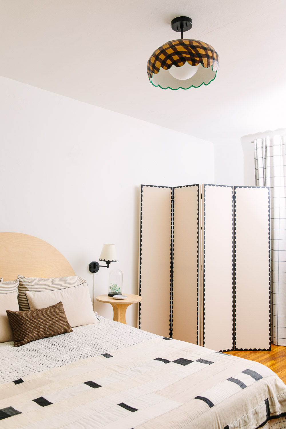 Quilt and pendant light: made by Corrie. Sconce: Amazon, scallops painted by Corrie. Room divider: “Ryan and I made it with canvas, and I painted the scallops.”