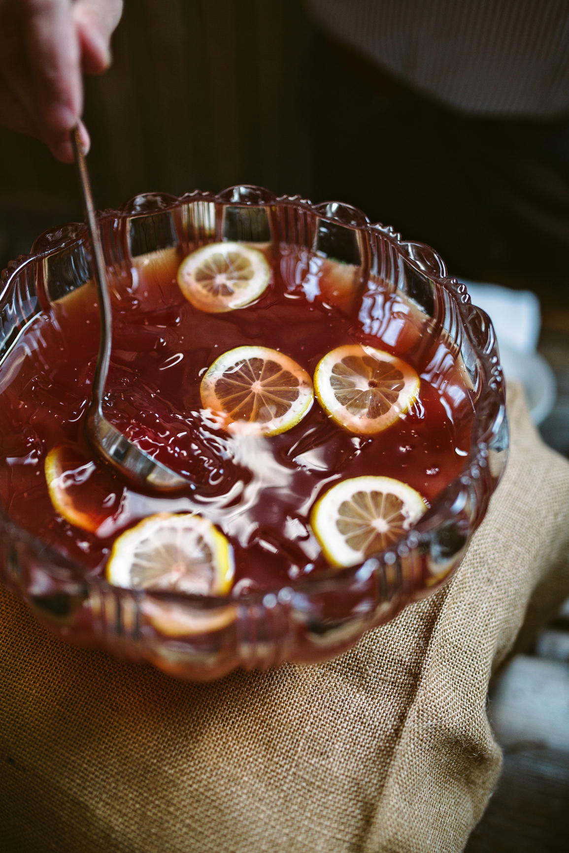 What is a Punchbowl Party? It’s just a regular party, but with a big bowl of punch, thereby immediately transforming a regular event into something festive. Lo and behold, when I arrived at Lee’s house, everyone was standing around the table with the punch, talking about the punch, praising the punchbowl (vintage, her mom’s), ladling the punch (using her mom’s antique silver ladle), and of course drinking the punch. It probably won’t surprise you to hear that Lee’s family is from the South, where they know from punches.