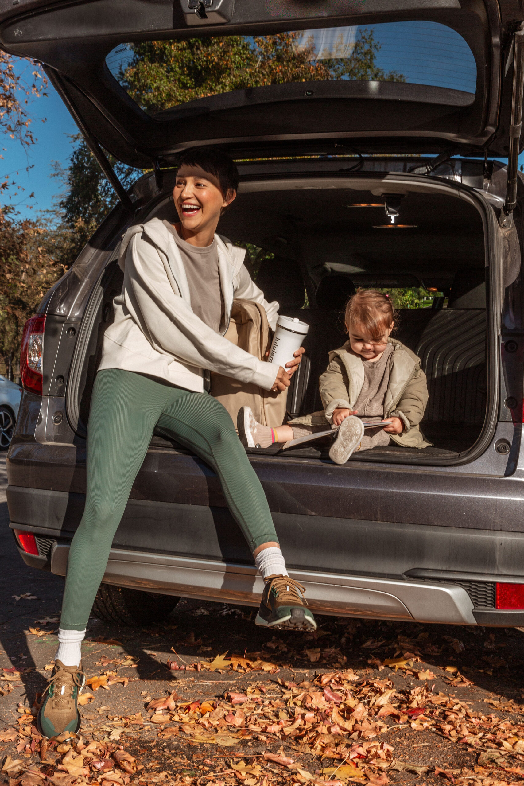 Briana is wearing the scuba hoodie, classic cotton tee, ribbed high-rise pant, trail running shoes, comfort socks and wool beanie.