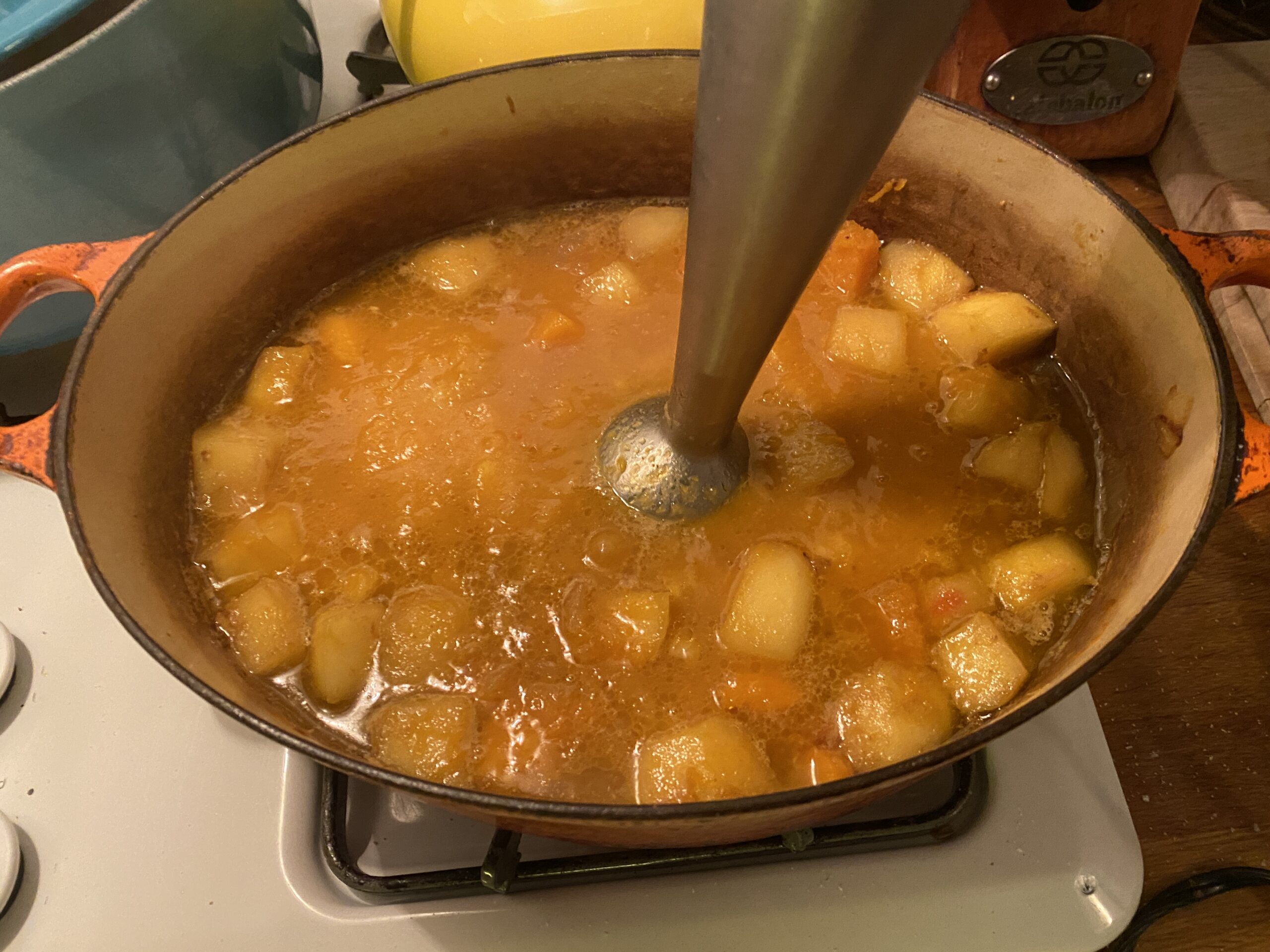 The other kind of soup to make is the kind where you add something hard but porous – think Butternut squash, think potatoes, think fennel – and allow it to cook in the liquid for an hour or so until a knife goes through it easily, at which point you blend or smash, depending on what kind of texture you prefer – chunky or smooth.