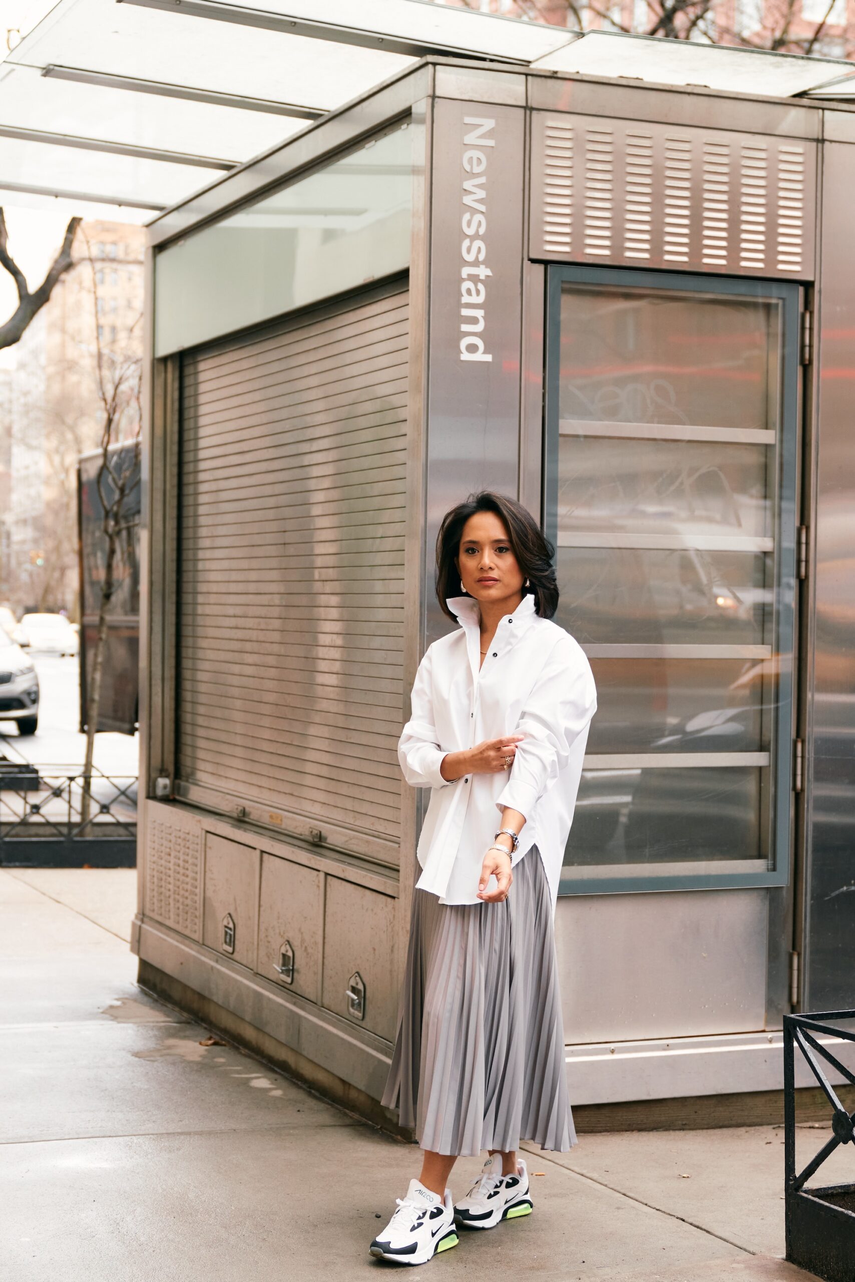Skirt: Club Monaco, no longer available, similar. Shirt: Mother Oxford. Sneakers: Nike Air Max 200 Command Force, similar.