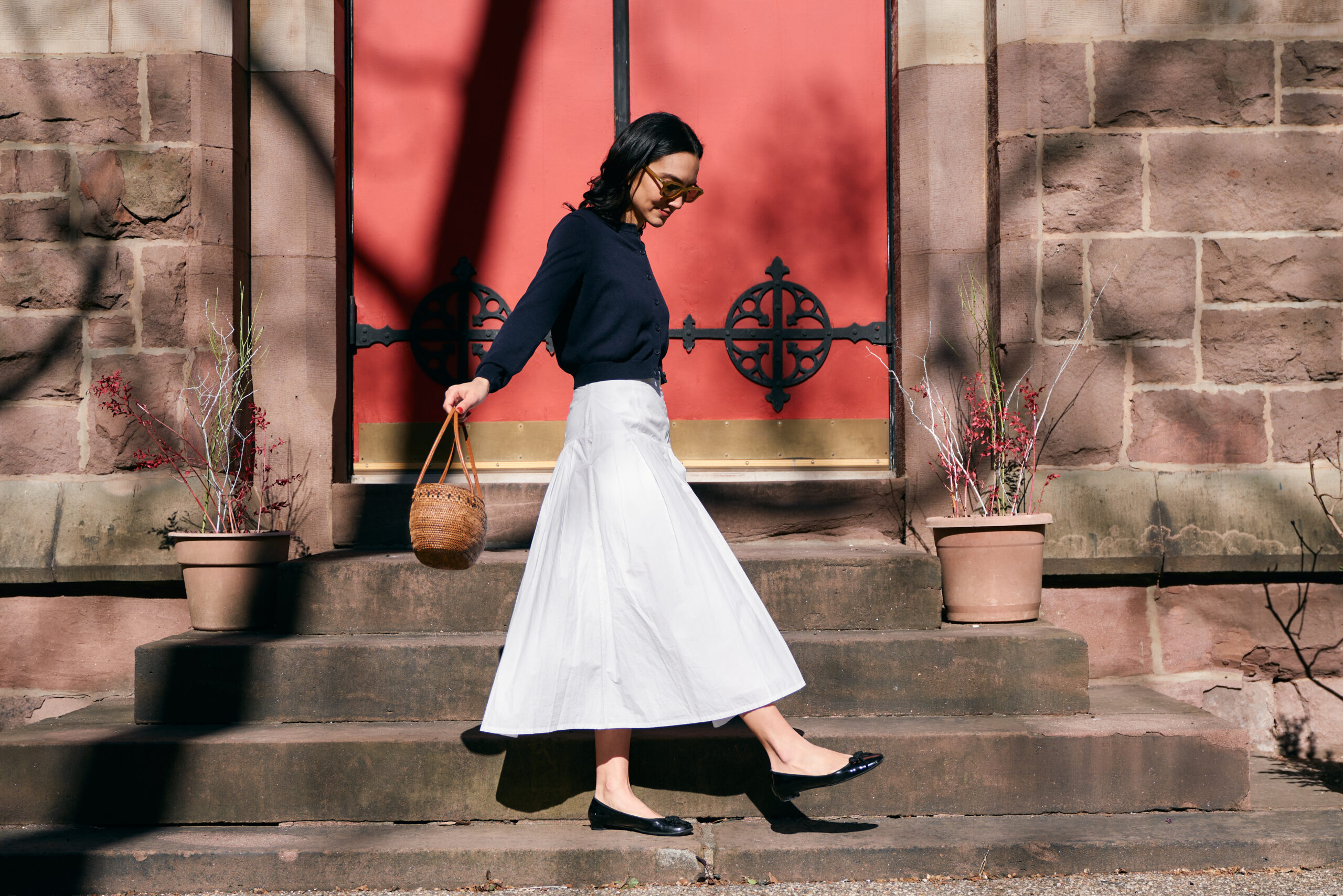 Sunglasses: Crap Eyewear. Sweater: Brandy Melville, no longer available, similar. T-shirt: Cotton:On. Flats: “Salvatore Ferragamo, purchased secondhand from Poshmark,” similar. Skirt: Comptoir des Cotonniers, no longer available, similar. Bag: “An artisan’s bag purchased in Colombia. This is the store and a similar bag.”