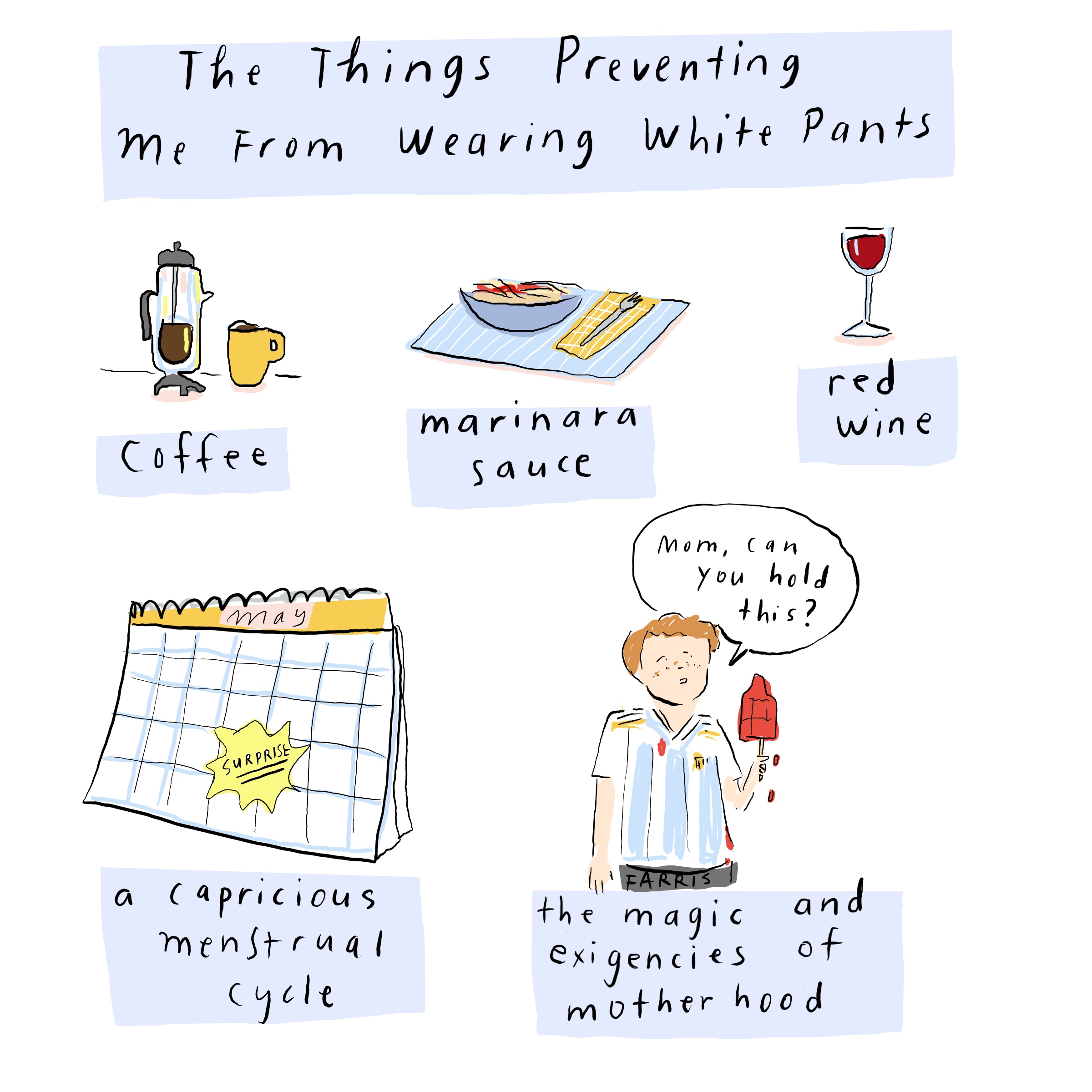 I stopped wearing white pants when I was in my early 30’s for all of the reasons expressed in the cartoon. I am now in my 50’s and still do not wear white pants.