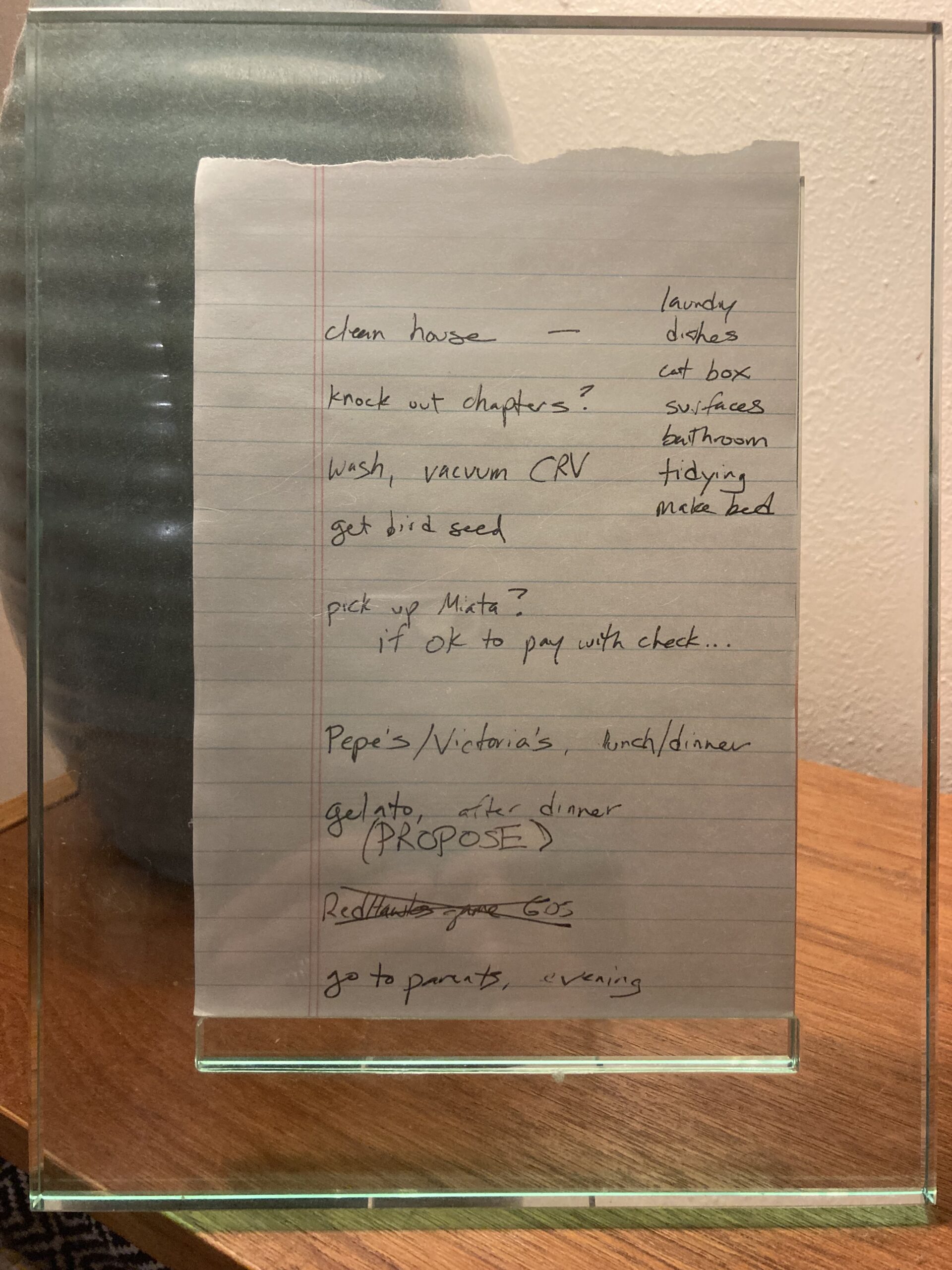“Neal proposed in August 2013, and I said yes. Afterward, at his house, I spotted this to-do list – which included the item ‘PROPOSE.’ He didn’t think saving it was quite as romantic as I did. (‘I wrote ‘kitty litter’ on that!” he exclaimed.) But it has now graced our bookshelves for the past decade. In some ways, the entries have not changed much from that first list. There’s always the endless kitchen cleanup, laundry, and litter scooping for our cats. But what I love about Neal’s to-do lists is that they always include some bigger-picture way of making things better. Maybe that is a Target run for our tea-and-reading time together after our three kids go to bed; maybe it’s organizing the garage so we can actually park a car in it during storm season; maybe it’s adding something fun to do as a family.” — Emily